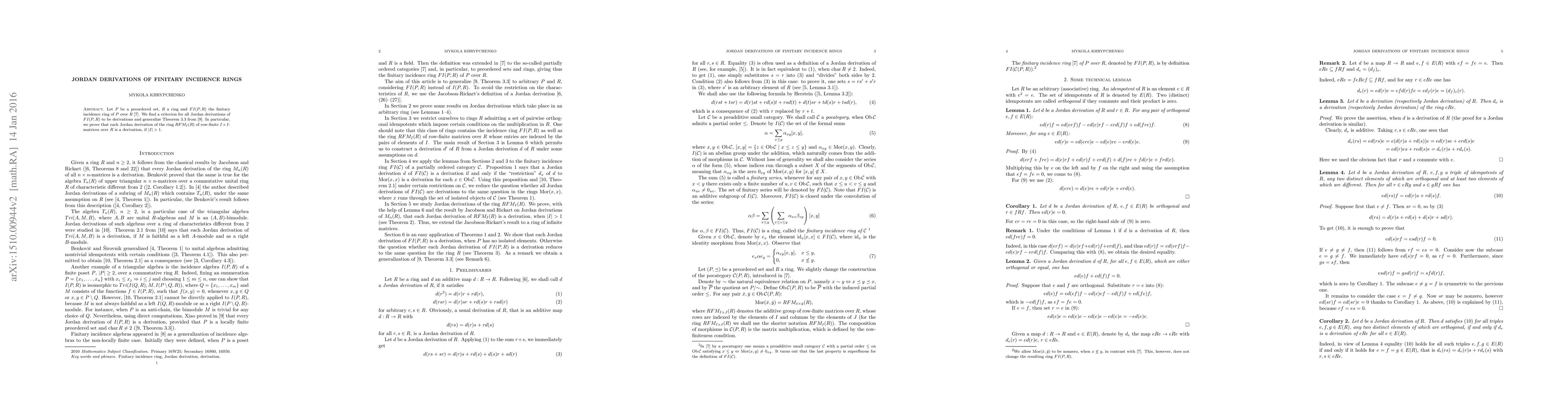 Let $P$ be a preordered set, $R$ a ring and $FI(P,R)$ the finitary incidence ring of $P$ over $R$. We find a criterion for all Jordan derivations of $FI(P,R)$ to be derivations and generalize Theorem 3.3 from arXiv:1411.6123. In particular, we prove that each Jordan derivation of the ring $RFM_I(R)$ of row-finite $I\times I$-matrices over $R$ is a derivation, if $|I|>1$.