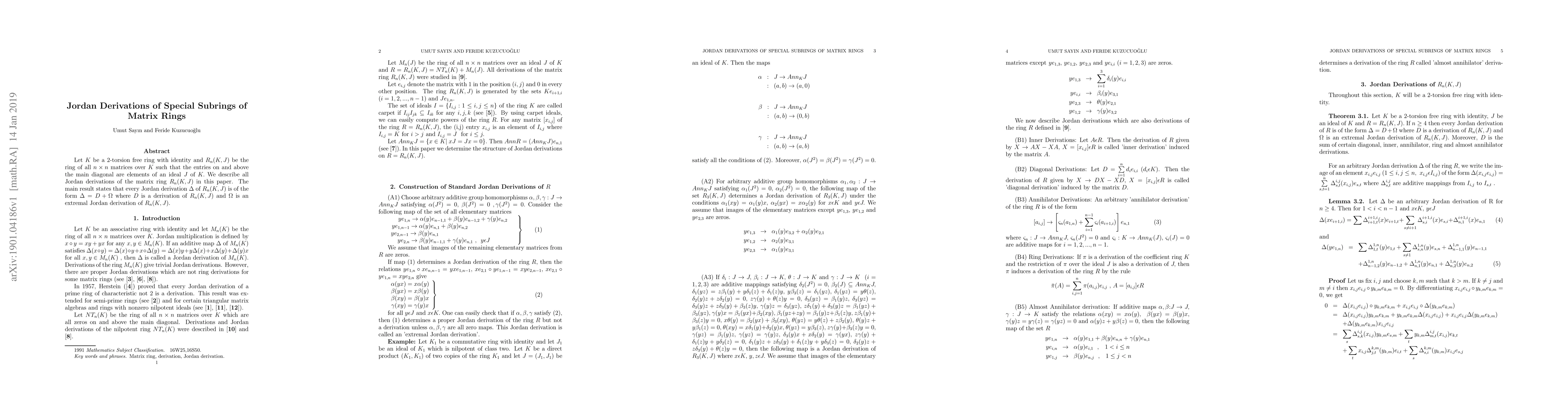 Let $K$ be a 2-torsion free ring with identity and $R_{n}(K,J)$ be the ring of all $n\times n$ matrices over $K$ such that the entries on and above the main diagonal are elements of an ideal $J$ of $K.$ We describe all Jordan derivations of the matrix ring $R_{n}(K,J)$ in this paper. The main result states that every Jordan derivation $\Delta $ of $R_{n}(K,J)$ is of the form $\Delta =D+\Omega $ where $D$ is a derivation of $R_{n}(K,J)$ and $\Omega $ is an extremal Jordan derivation of $R_{n}(K,J).$