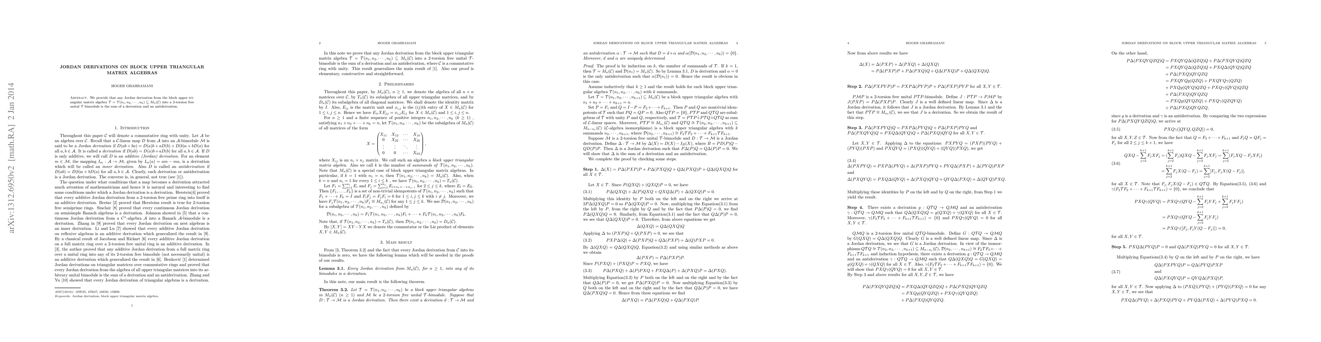 We provide that any Jordan derivation from the block upper triangular matrix algebra $\T = \T(n_{1},n_{2}, \cdots, n_{k})\subseteq M_{n}(\mathbb{\C})$ into a $2$-torsion free unital $\T$-bimodule is the sum of a derivation and an antiderivation.