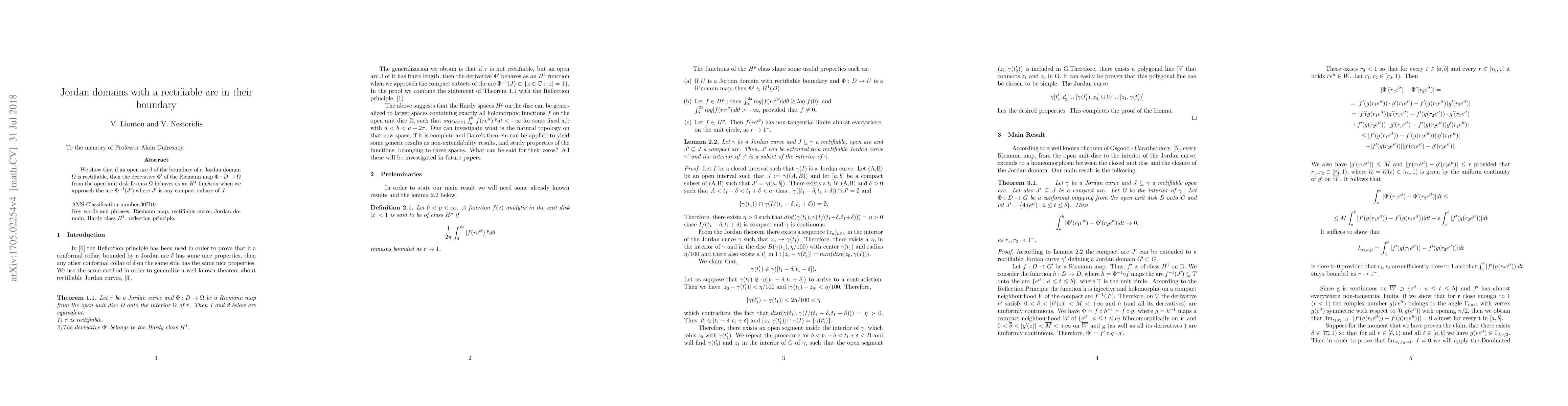 We show that if an open arc J of the boundary of a Jordan domain $\Omega$ is rectifiable, then the derivative $\Phi$' of the Riemann map $\Phi: D\rightarrow \Omega$ from the open unit disk D onto $\Omega$ behaves as an $H^1$ function when we approach the arc $\Phi^{-1}(J^{\prime})$,where $J^{\prime}$ is any compact subarc of $J$. "