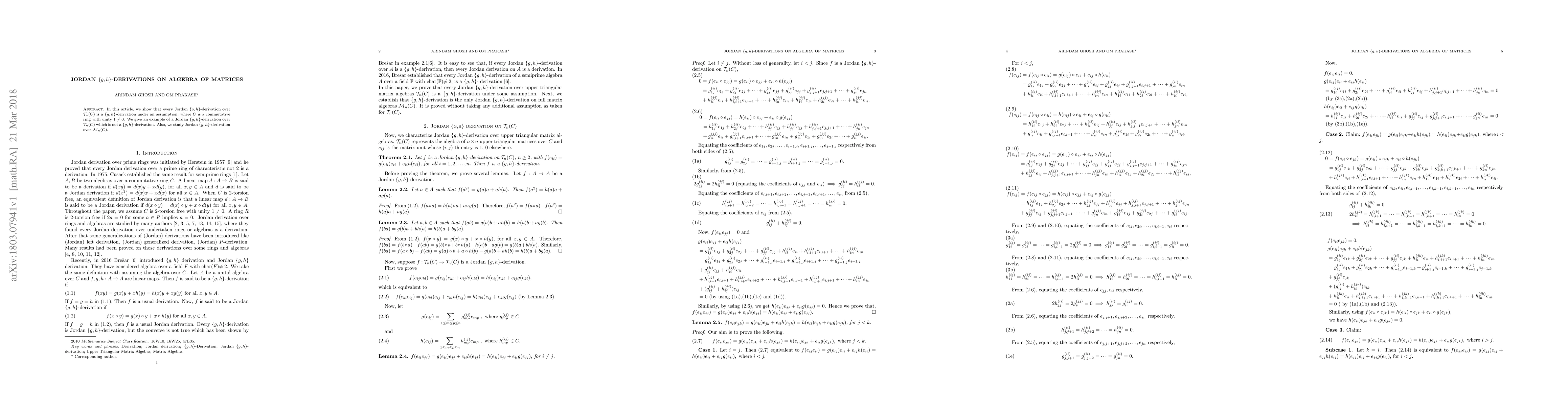 In this article, we show that every Jordan {g, h}-derivation over T_n(C) is a {g, h}-derivation under an assumption, where C is a commutative ring with unity 1 not equal to 0. We give an example of a Jordan {g, h}-derivation over T_n(C) which is not a {g, h}-derivation. Also, we study Jordan {g, h}-derivation over M_n(C).