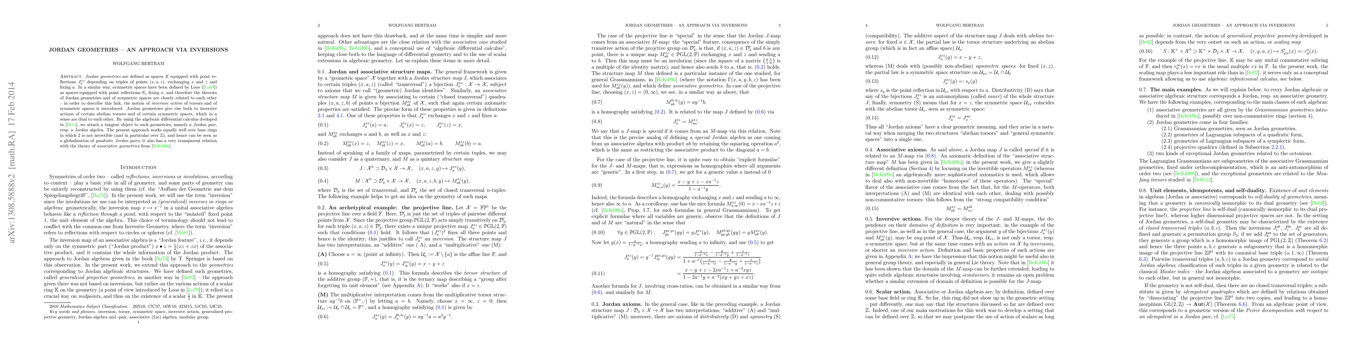 This paper introduces Jordan geometries as spaces with point reflections based on triples of points, showing a connection to symmetric spaces and attaching tangent objects like Jordan pairs or algebras.