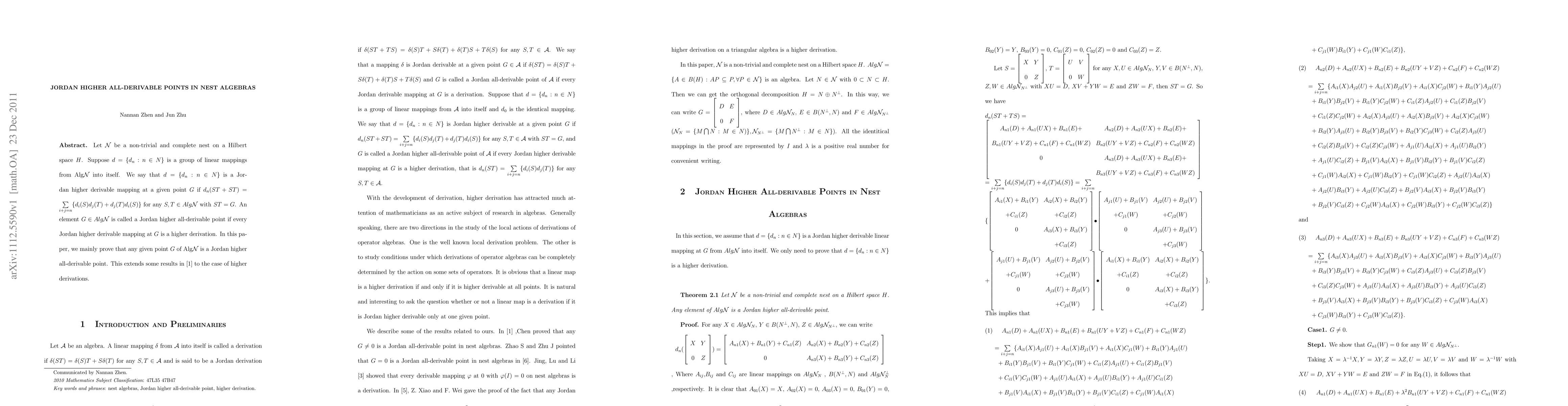 Let $\mathcal{N}$ be a non-trivial and complete nest on a Hilbert space $H$. Suppose $d=\{d_n: n\in N\}$ is a group of linear mappings from Alg$\mathcal{N}$ into itself. We say that $d=\{d_n: n\in N\}$ is a Jordan higher derivable mapping at a given point $G$ if $d_{n}(ST+ST)=\sum\limits_{i+j=n}\{d_{i}(S)d_{j}(T)+d_{j}(T)d_{i}(S)\}$ for any $S,T\in Alg \mathcal{N}$ with $ST=G$. An element $G\in Alg \mathcal{N}$ is called a Jordan higher all-derivable point if every Jordan higher derivable mapping at $G$ is a higher derivation. In this paper, we mainly prove that any given point $G$ of Alg$\mathcal{N}$ is a Jordan higher all-derivable point. This extends some results in \cite{Chen11} to the case of higher derivations.