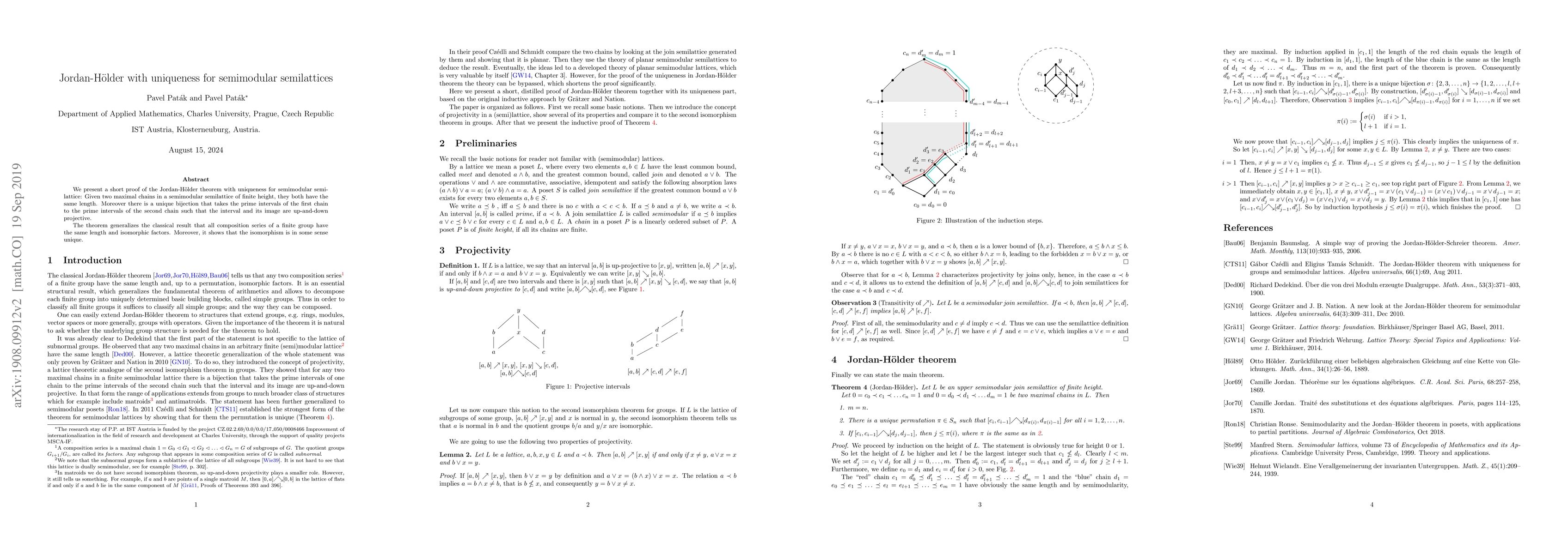 We present a short proof of the Jordan-H\"older theorem with uniqueness for semimodular semilattice: Given two maximal chains in a semimodular semilattice of finite height, they both have the same length. Moreover there is a unique bijection that takes the prime intervals of the first chain to the prime intervals of the second chain such that the interval and its image are up-and-down projective. The theorem generalizes the classical result that all composition series of a finite group have the same length and isomorphic factors. Moreover, it shows that the isomorphism is in some sense unique.