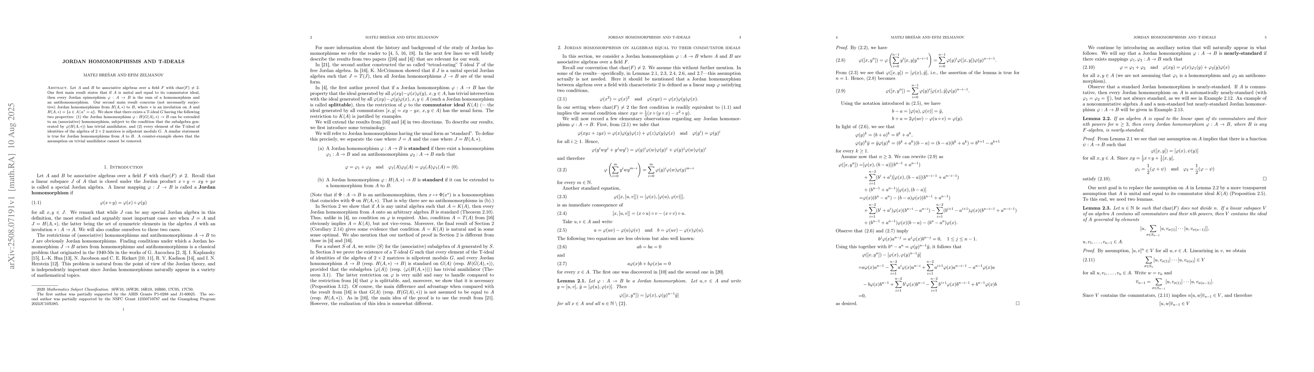 Let $A$ and $B$ be associative algebras over a field $F$ with {\rm char}$(F)\ne 2$. Our first main result states that if $A$ is unital and equal to its commutator ideal, then every Jordan epimorphism $\varphi:A\to B$ is the sum of a homomorphism and an antihomomorphism. Our second main result concerns (not necessarily surjective) Jordan homomorphisms from $H(A,*)$ to $B$, where $*$ is an involution on $A$ and $H(A,*)=\{a\in A\,|\, a^*=a\}$. We show that there exists a ${\rm T}$-ideal $G$ having the following two properties: (1) the Jordan homomorphism $\varphi:H(G(A),*)\to B$ can be extended to an (associative) homomorphism, subject to the condition that the subalgebra generated by $\varphi(H(A,*))$ has trivial annihilator, and (2) every element of the ${\rm T}$-ideal of identities of the algebra of $2\times 2$ matrices is nilpotent modulo $G$. A similar statement is true for Jordan homomorphisms from $A$ to $B$. A counter-example shows that the assumption on trivial annihilator cannot be removed.