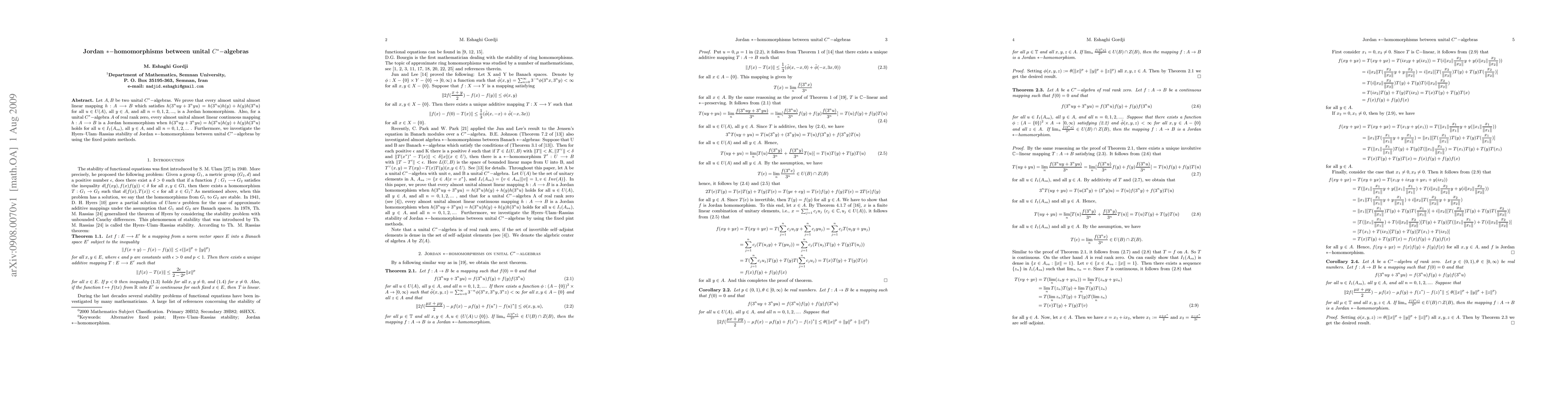 This paper proves that almost unital almost linear mappings between unital $C^*$-algebras satisfying a specific functional equation are Jordan homomorphisms. It also explores the Hyers-Ulam-Rassias stability of Jordan $*$-homomorphisms using fixed point methods.