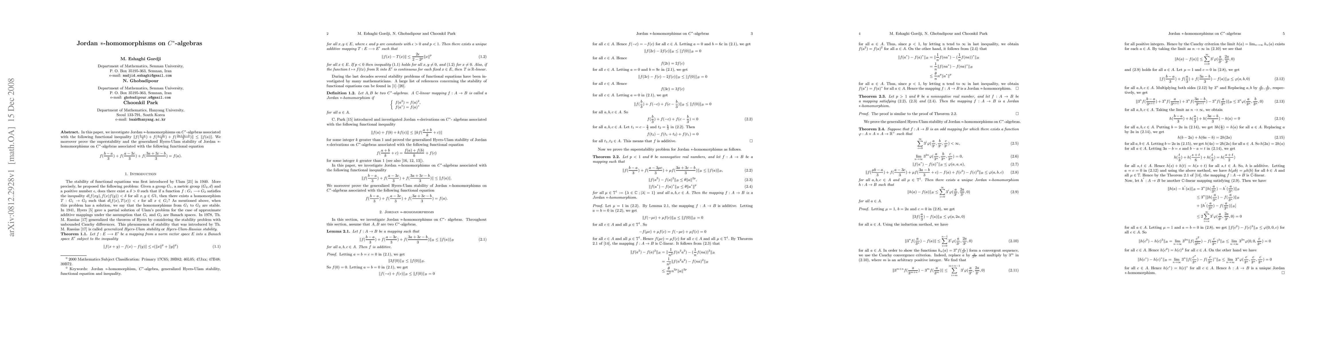 This paper investigates Jordan *-homomorphisms on $C^*$-algebras, proving their superstability and generalized Hyers-Ulam stability under a specific functional inequality and associated functional equation.
