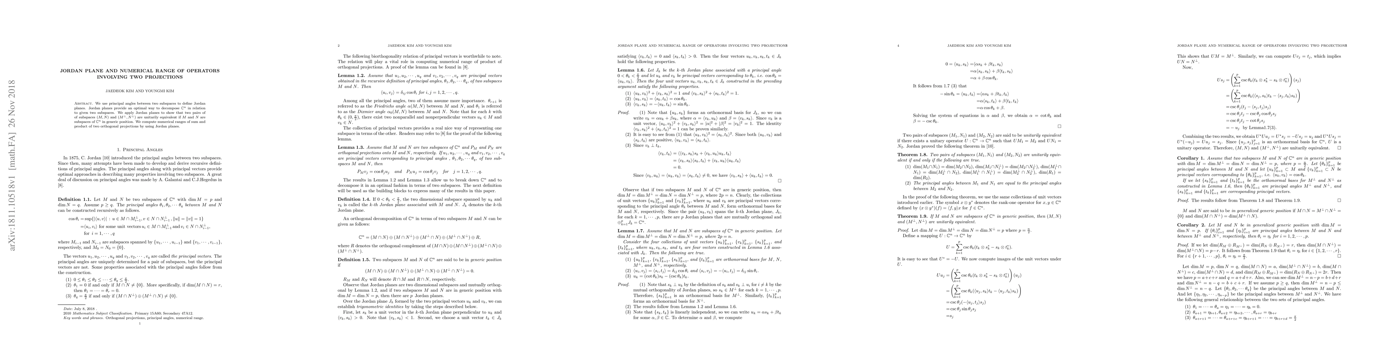 This paper defines Jordan planes using principal angles between subspaces to decompose $\mathbb{C}^n$ optimally. It demonstrates the unitarily equivalence of two pairs of subspaces and computes the numerical ranges of sums and products of orthogonal projections via Jordan planes.