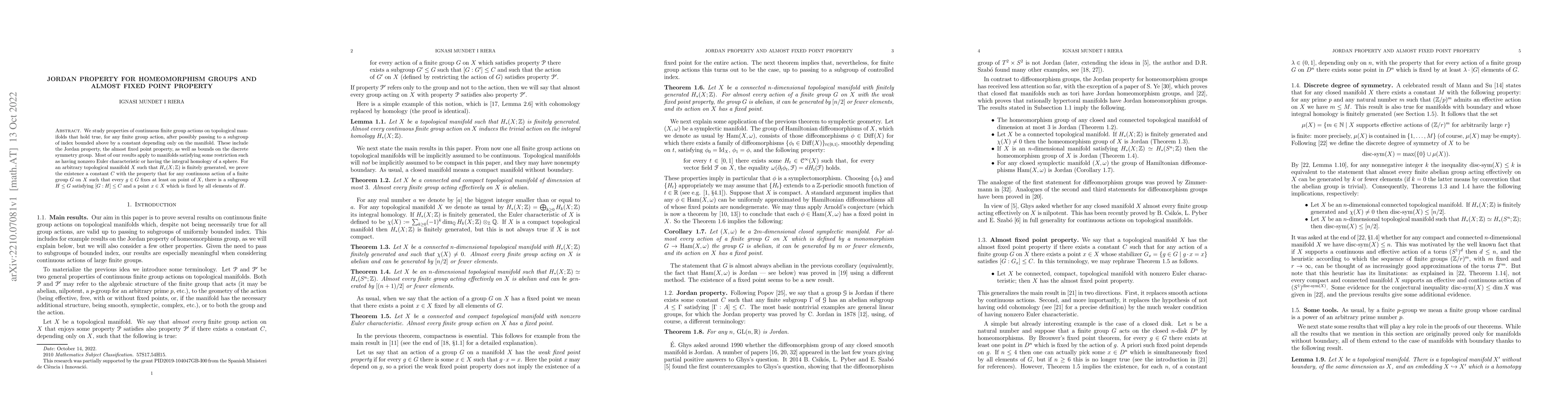 This paper investigates the Jordan property and almost fixed point property for continuous finite group actions on topological manifolds, proving that these properties hold after passing to a subgroup of bounded index. It establishes bounds on the discrete symmetry group for manifolds with specific homology characteristics.