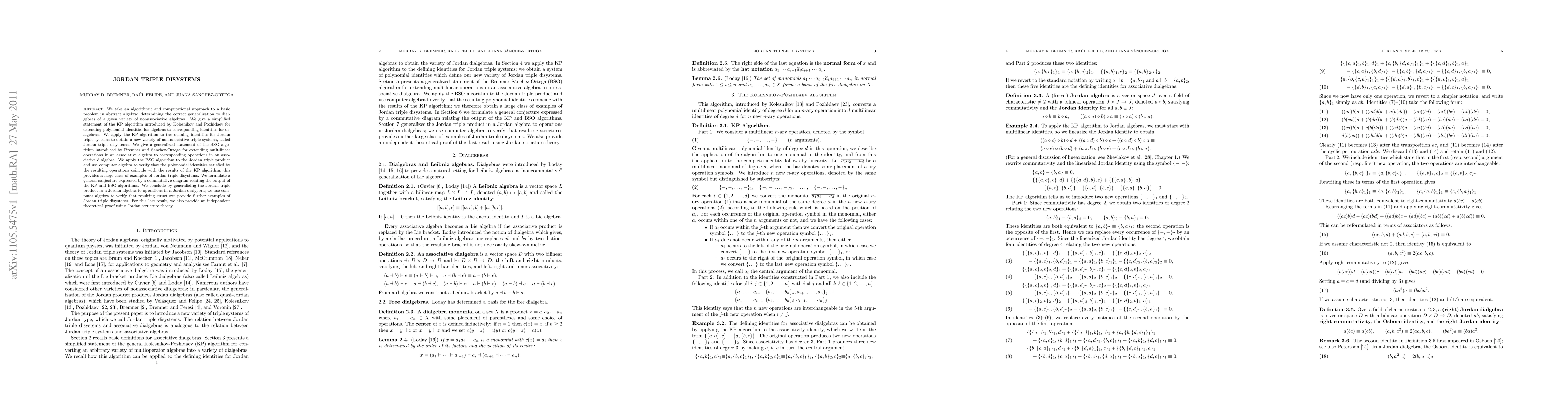 We take an algorithmic and computational approach to a basic problem in abstract algebra: determining the correct generalization to dialgebras of a given variety of nonassociative algebras. We give a simplified statement of the KP algorithm introduced by Kolesnikov and Pozhidaev for extending polynomial identities for algebras to corresponding identities for dialgebras. We apply the KP algorithm to the defining identities for Jordan triple systems to obtain a new variety of nonassociative triple systems, called Jordan triple disystems. We give a generalized statement of the BSO algorithm introduced by Bremner and Sanchez-Ortega for extending multilinear operations in an associative algebra to corresponding operations in an associative dialgebra. We apply the BSO algorithm to the Jordan triple product and use computer algebra to verify that the polynomial identities satisfied by the resulting operations coincide with the results of the KP algorithm; this provides a large class of examples of Jordan triple disystems. We formulate a general conjecture expressed by a commutative diagram relating the output of the KP and BSO algorithms. We conclude by generalizing the Jordan triple product in a Jordan algebra to operations in a Jordan dialgebra; we use computer algebra to verify that resulting structures provide further examples of Jordan triple disystems. For this last result, we also provide an independent theoretical proof using Jordan structure theory.