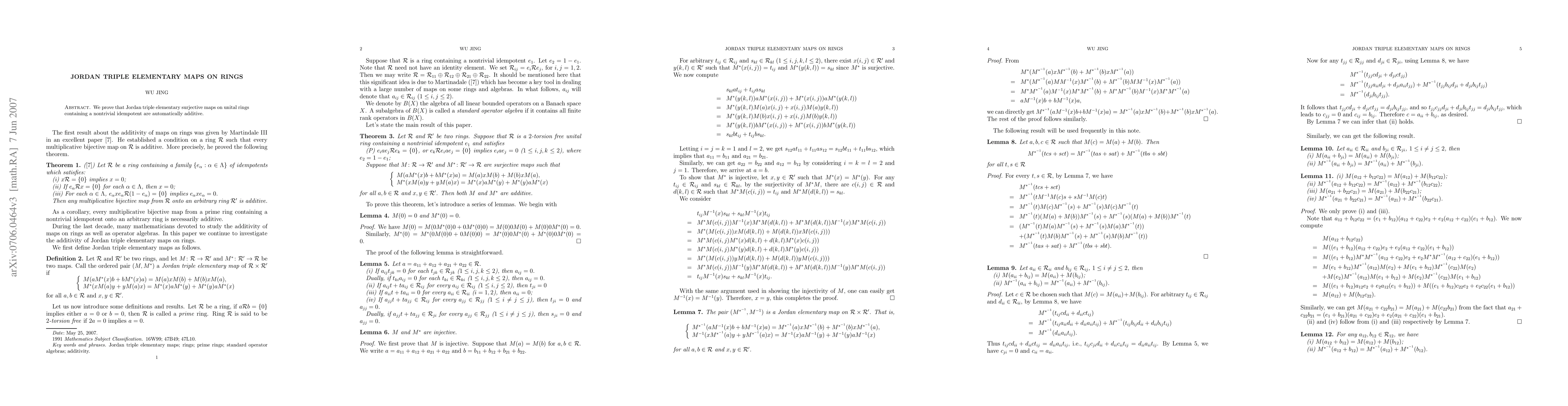 Summary: This paper demonstrates that surjective Jordan triple elementary maps on unital rings with nontrivial idempotents are inherently additive. The result highlights a fundamental property of such mappings in algebraic structures.