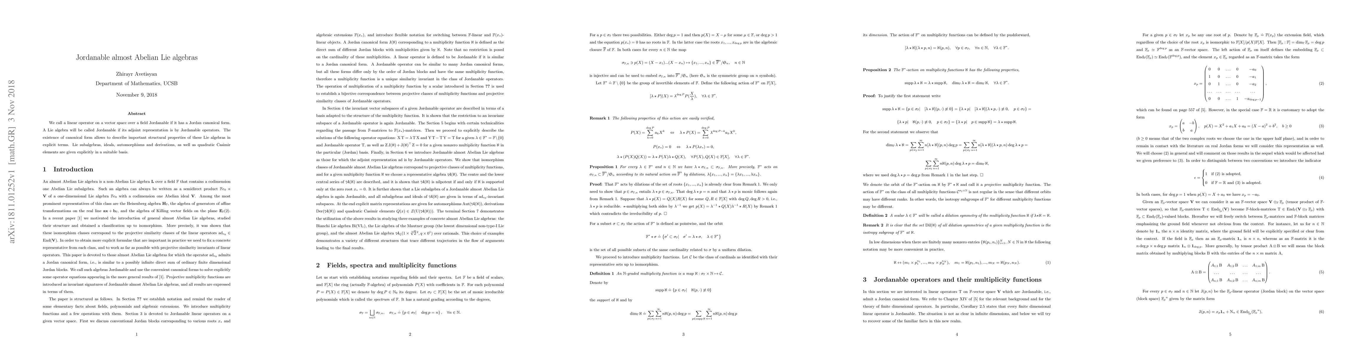 This paper explores Jordanable almost Abelian Lie algebras, where the single non-vanishing Lie bracket is Jordanable, allowing for explicit descriptions of structural properties, including subalgebras, ideals, automorphisms, derivations, and quadratic Casimir elements.