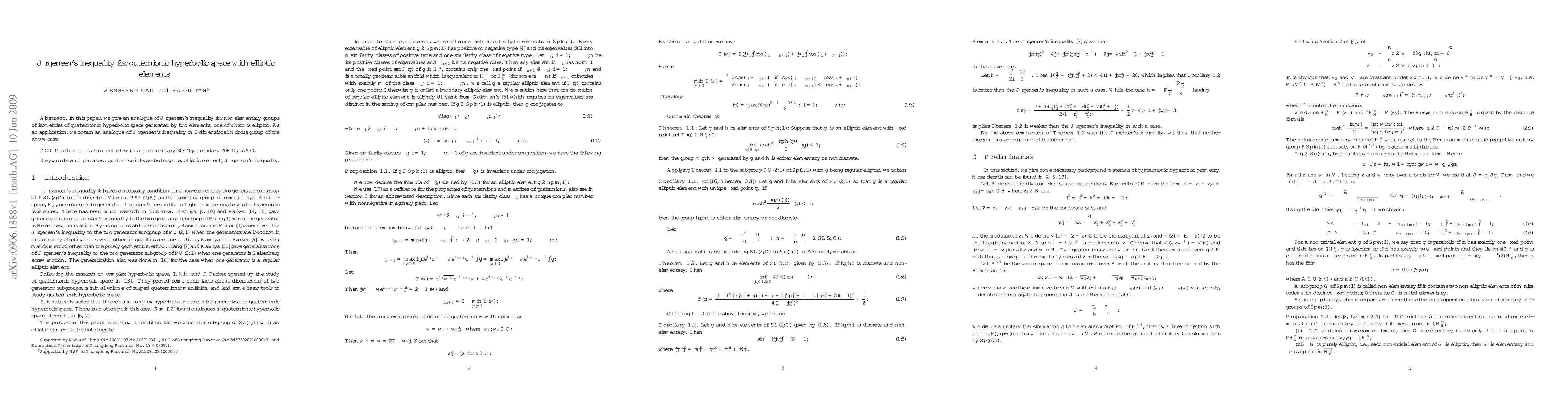 Summary: This paper establishes an analogue of Jorgensen's inequality for non-elementary groups of isometries in quaternionic hyperbolic space, focusing on groups generated by two elements, one elliptic. It also extends this result to the 2-dimensional Möbius group.