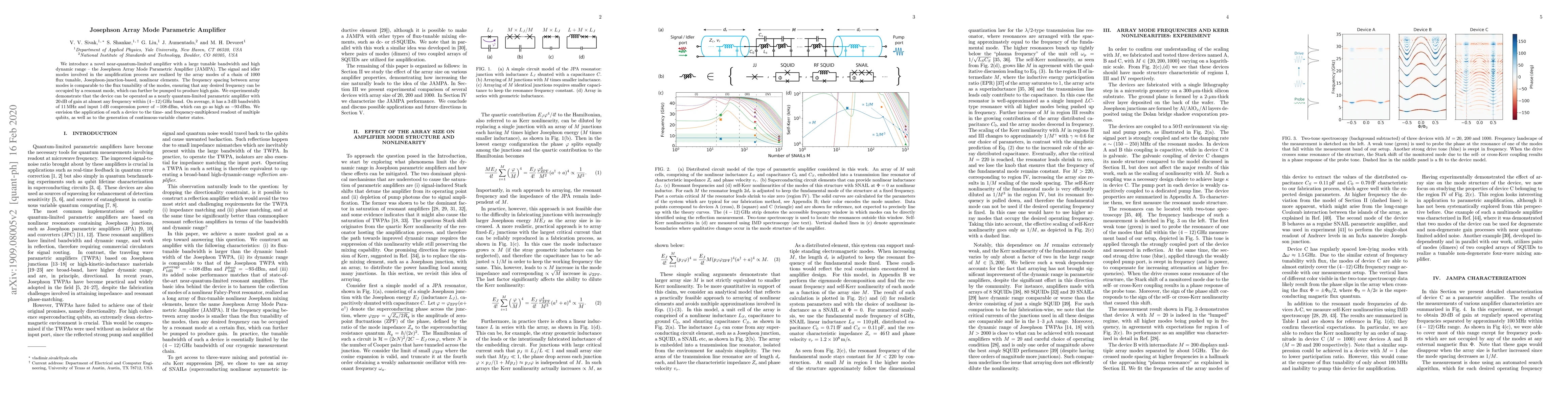 The paper introduces the Josephson Array Mode Parametric Amplifier (JAMPA), a near-quantum-limited amplifier with a large tunable bandwidth and high dynamic range, demonstrating 20 dB gain across a (4-12) GHz band with an average 3 dB bandwidth of 11 MHz. Potential applications include qubit readout and continuous-variable cluster states generation.