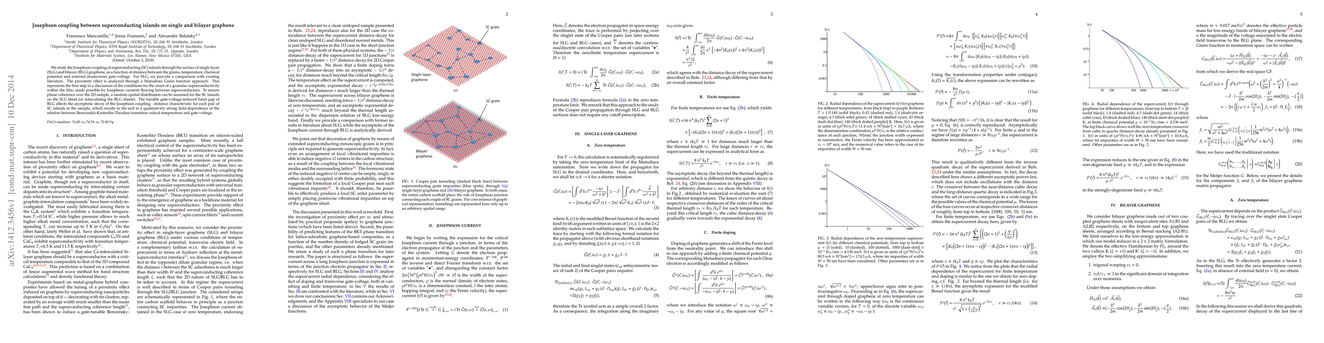 We study the Josephson coupling of superconducting (SC) islands through the surface of single-layer (SLG) and bilayer (BLG) graphene, as a function of distance between the grains, temperature, chemical potential and external (transverse) gate-voltage. For SLG, we provide a comparison with existing literature. The proximity effect is analyzed through a Matsubara Green function approach. This represents the first step in a discussion of the conditions for the onset of a granular superconductivity within the film, made possible by Josephson currents flowing between superconductors. To ensure phase coherence over the 2D sample, a random spatial distribution can be assumed for the SC islands on the SLG sheet (or intercalating the BLG sheets). The tunable gate-voltage-induced band gap of BLG affects the asymptotic decay of the Josephson coupling-distance characteristic for each pair of SC islands in the sample, which results in the end in a qualitatively strong field-dependence of the relation between Berezinskii-Kosterlitz-Thouless transition critical temperature and gate-voltage.