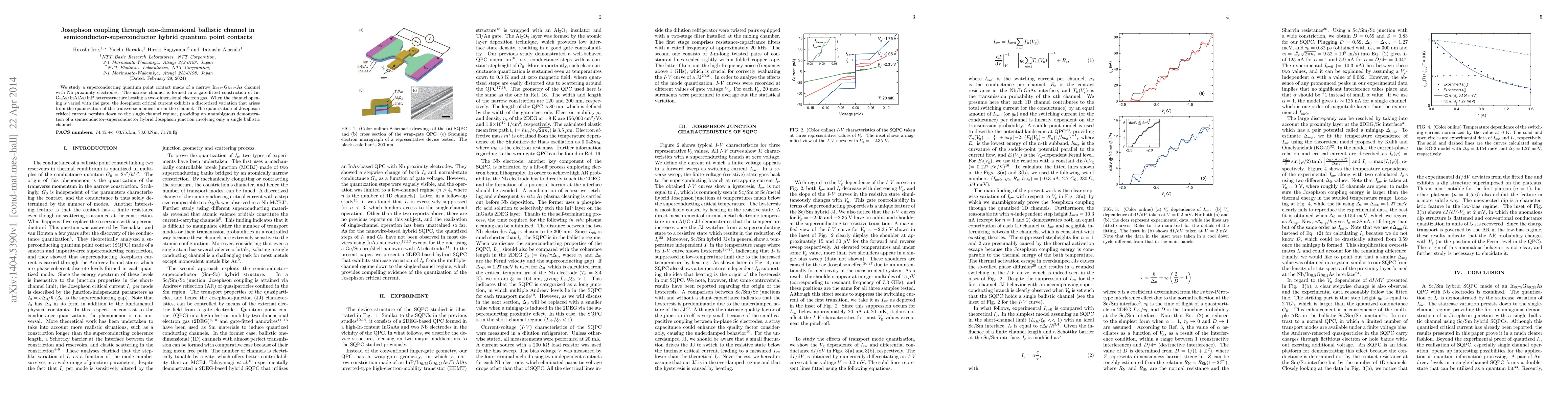We study a superconducting quantum point contact made of a narrow In$_{0.75}% $Ga$_{0.25}$As channel with Nb proximity electrodes. The narrow channel is formed in a gate-fitted constriction of InGaAs/InAlAs/InP heterostructure hosting a two-dimensional electron gas. When the channel opening is varied with the gate, the Josephson critical current exhibits a discretized variation that arises from the quantization of the transverse momentum in the channel. The quantization of Josephson critical current persists down to the single-channel regime, providing an unambiguous demonstration of a semiconductor--superconductor hybrid Josephson junction involving only a single ballistic channel.