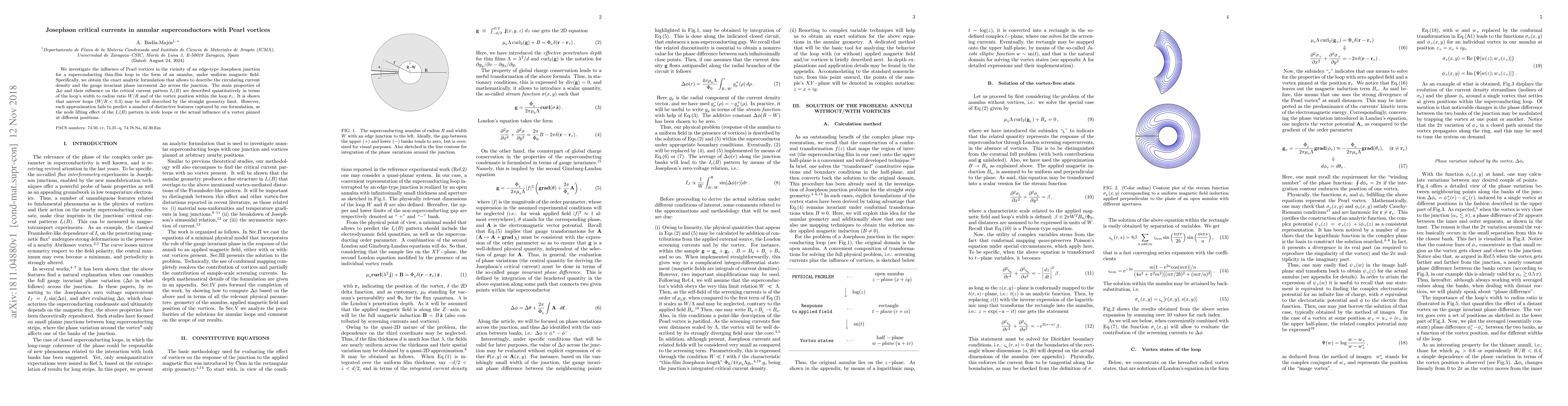 This paper provides an exact analytic formulation for the circulating current density and phase increment across an edge-type Josephson junction in annular superconductors with Pearl vortices. It reveals distinctive features in the critical current pattern influenced by the loop's geometry and vortex position, particularly for wide loops.