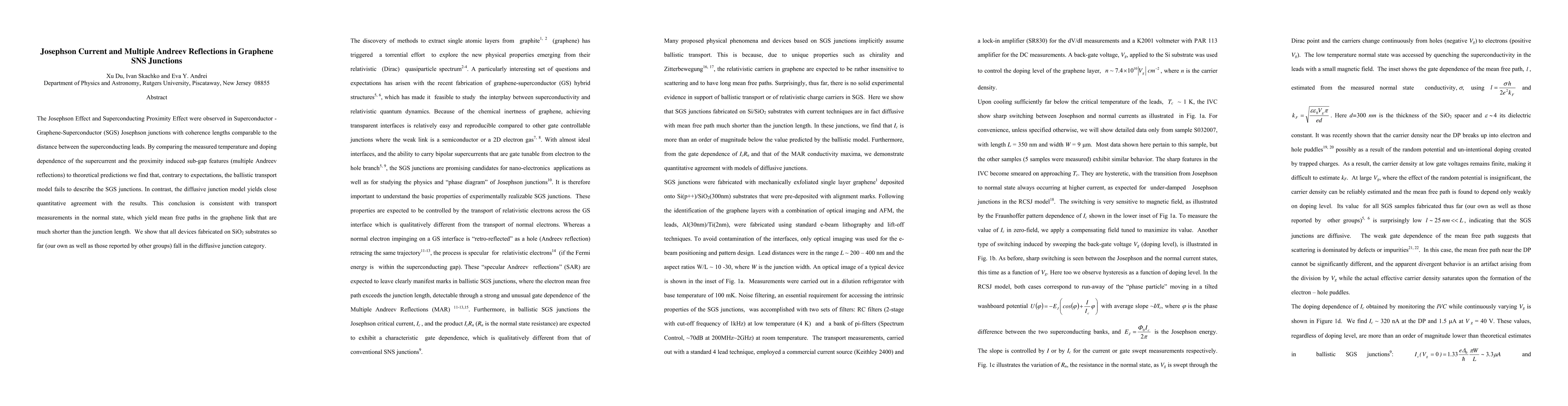 This research reveals that diffusive transport models, rather than ballistic transport models, accurately describe Superconductor-Graphene-Superconductor (SGS) junctions, as evidenced by the observed Josephson effect and multiple Andreev reflections, which align with short mean free paths in graphene.