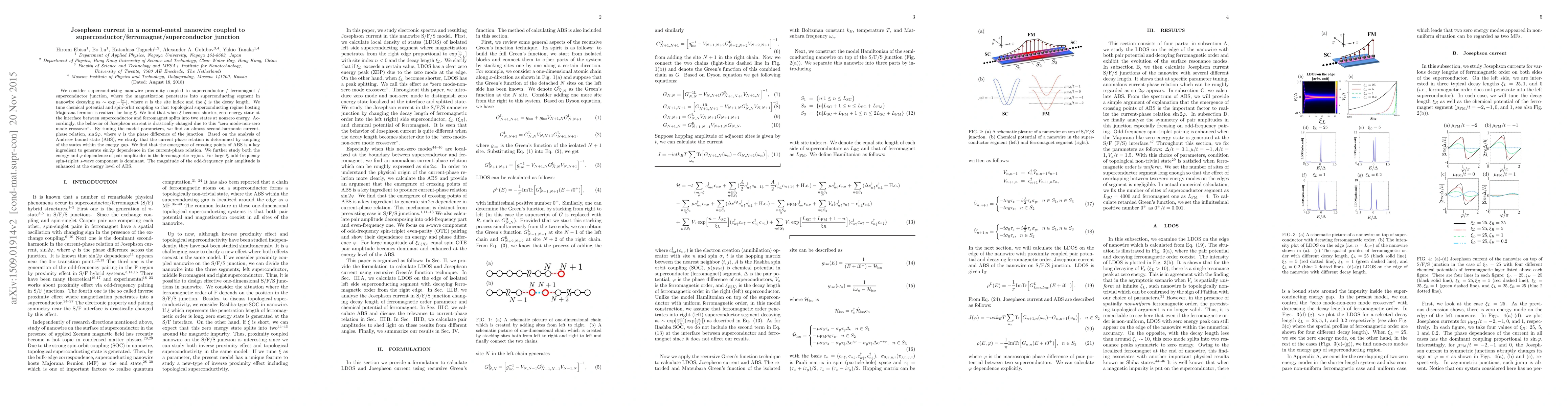 We consider superconducting nanowire proximity coupled to superconductor / ferromagnet / superconductor junction, where the magnetization penetrates into superconducting segment in nanowire decaying as $\sim\exp[-\frac{\mid n \mid}{\xi}]$ with site index $n$ and the decay length $\xi$. We tune chemical potential and spin-orbit coupling so that topological superconducting regime hosting Majorana fermion is realized for long $\xi$. We find that when $\xi$ becomes shorter, zero energy state at the interface between superconductor and ferromagnet splits into two away from zero energy. Accordingly, the behavior of Josephson current is drastically changed due to this "zero mode-non-zero mode crossover". By tuning the model parameters, we find an almost second-harmonic current-phase relation, $\sin2\varphi$, with phase difference $\varphi$. Based on the analysis of Andreev bound state (ABS), we clarify that current-phase relation is determined by coupling of the states within the energy gap. We find that the emergence of crossing points of ABS is a key ingredient to generate $\sin2\varphi$ dependence in current-phase relation. We further study both the energy and $\varphi$ dependence of pair amplitudes in the ferromagnetic region. For long $\xi$, odd-frequency spin-triplet $s$-wave component is dominant. The magnitude of the odd-frequency pair amplitude is enhanced at the energy level of ABS.