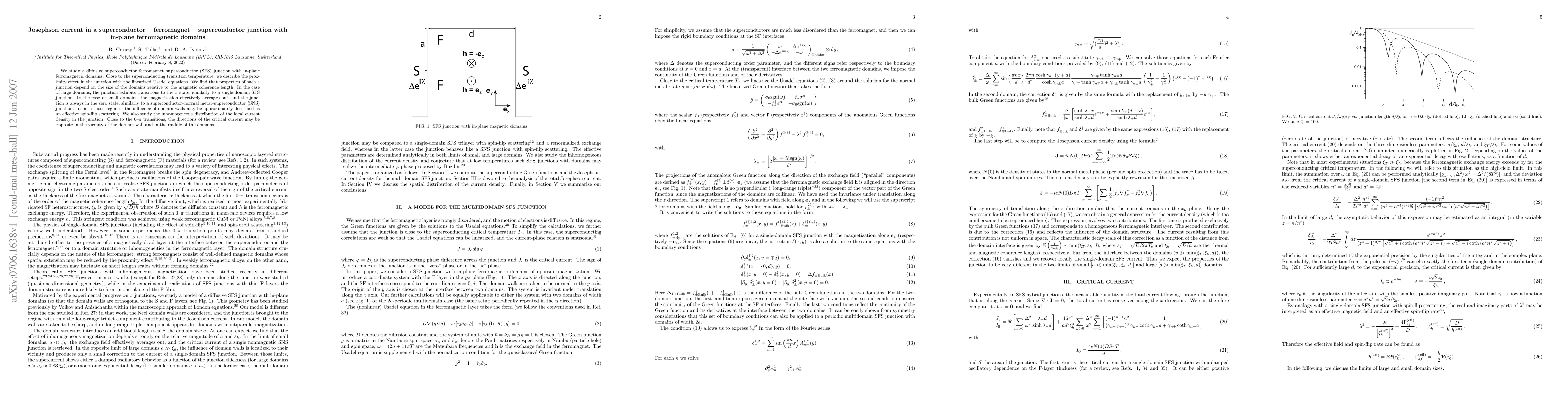 This paper investigates the Josephson current in a diffusive superconductor-ferromagnet-superconductor (SFS) junction with in-plane ferromagnetic domains, finding that junction behavior depends on domain size relative to the magnetic coherence length. The junction exhibits $\pi$ state transitions for large domains and zero state for small domains, with domain walls acting as effective spin-flip scattering.