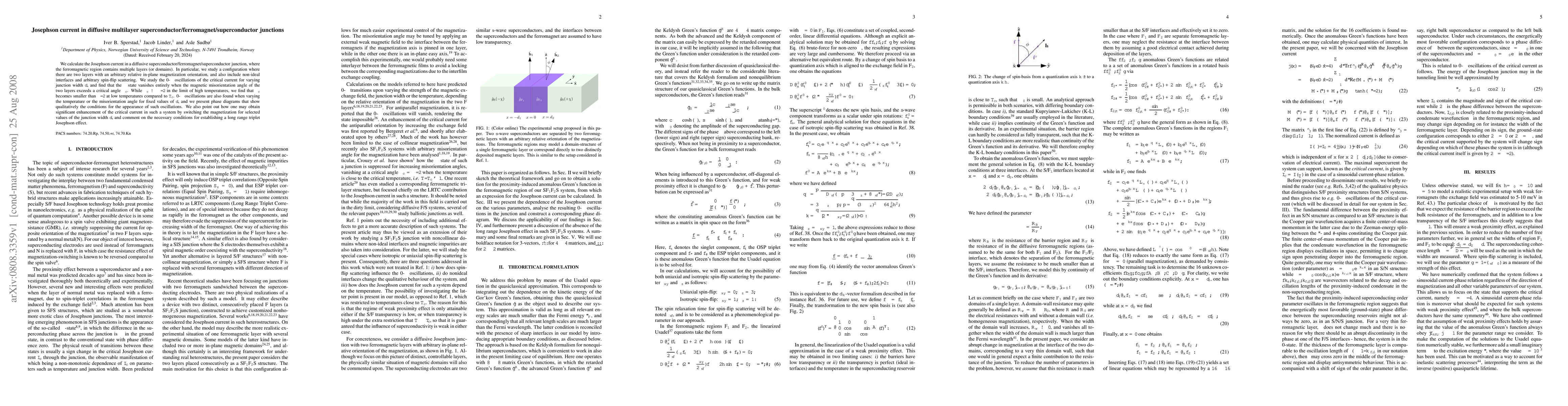 This paper investigates the Josephson current in multilayer superconductor/ferromagnet/superconductor junctions, revealing 0-$\pi$ oscillations in critical current influenced by varying junction width, temperature, and magnetic misorientation angles. The $\pi$ state vanishes when the magnetic misorientation angle exceeds a critical angle $\phi_c$, which is less than $\pi/2$ at low temperatures.