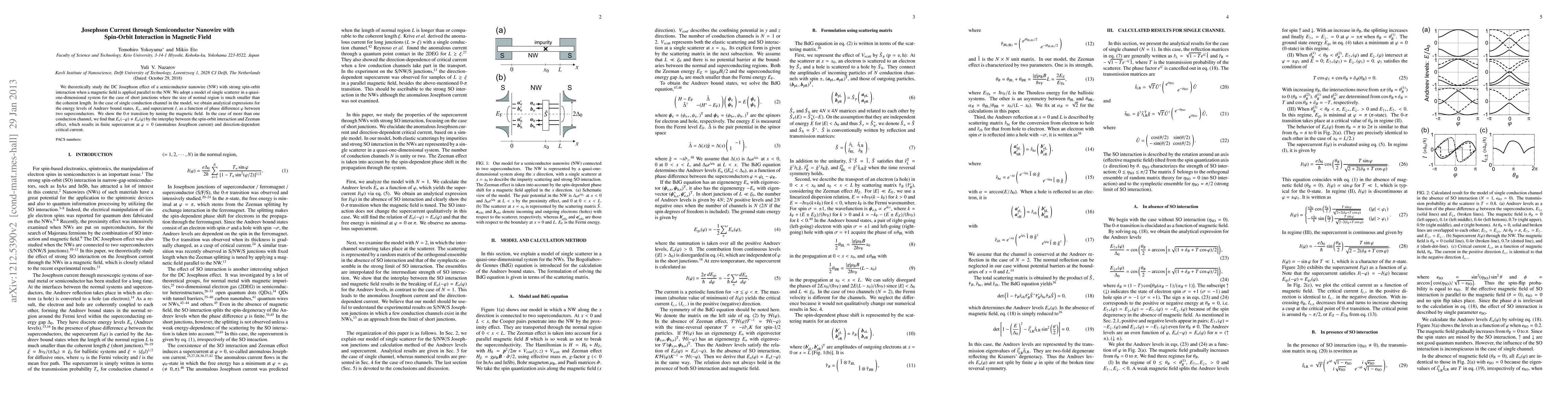 This paper theoretically investigates the DC Josephson effect in semiconductor nanowires with strong spin-orbit interaction under a parallel magnetic field, revealing a 0-$\pi$ transition and anomalous Josephson current due to interplay between spin-orbit interaction and Zeeman effect. Analytical expressions for energy levels and supercurrent are derived for both single and multiple conduction channels.