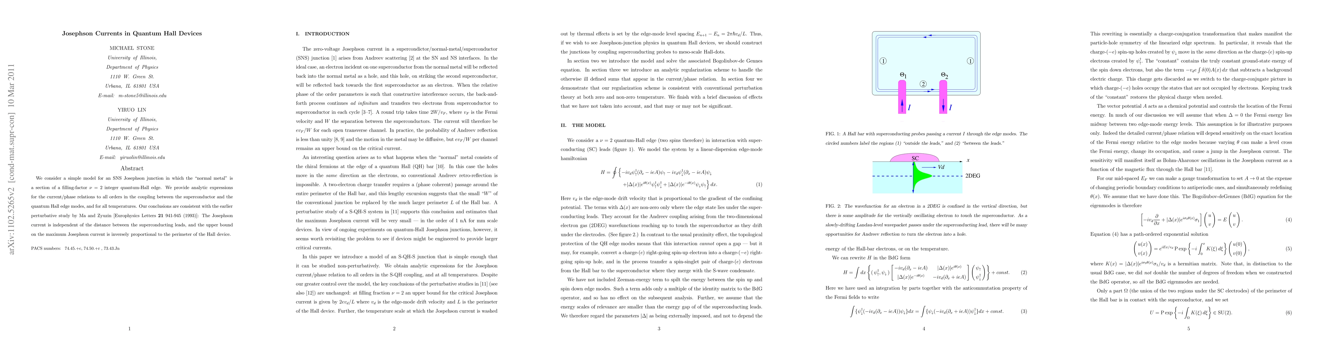 We consider a simple model for an SNS Josephson junction in which the "normal metal" is a section of a filling-factor $\nu=2$ integer quantum-Hall edge. We provide analytic expressions for the current/phase relations to all orders in the coupling between the superconductor and the quantum Hall edge modes, and for all temperatures. Our conclusions are consistent with the earlier perturbative study by Ma and Zyuzin [Europhysics Letters {\bf 21} 941-945 (1993)]: The Josephson current is independent of the distance between the superconducting leads, and the upper bound on the maximum Josephson current is inversely proportional to the perimeter of the Hall device.