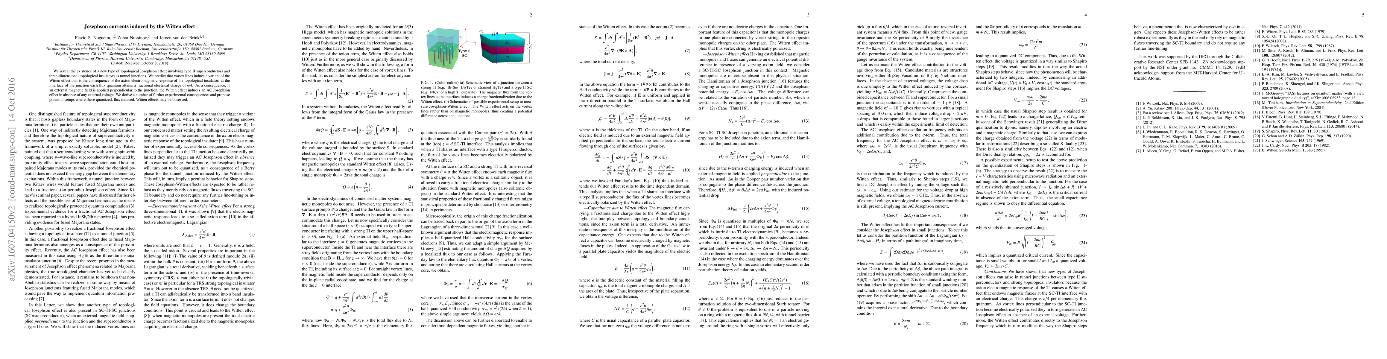 We reveal the existence of a new type of topological Josephson effect involving type II superconductors and three-dimensional topological insulators as tunnel junctions. We predict that vortex lines induce a variant of the Witten effect that is the consequence of the axion electromagnetic response of the topological insulator: at the interface of the junction each flux quantum attains a fractional electrical charge of e/4. As a consequence, if an external magnetic field is applied perpendicular to the junction, the Witten effect induces an AC Josephson effect in absence of any external voltage. We derive a number of further experimental consequences and propose potential setups where these {quantized, flux induced, Witten} effects may be observed.