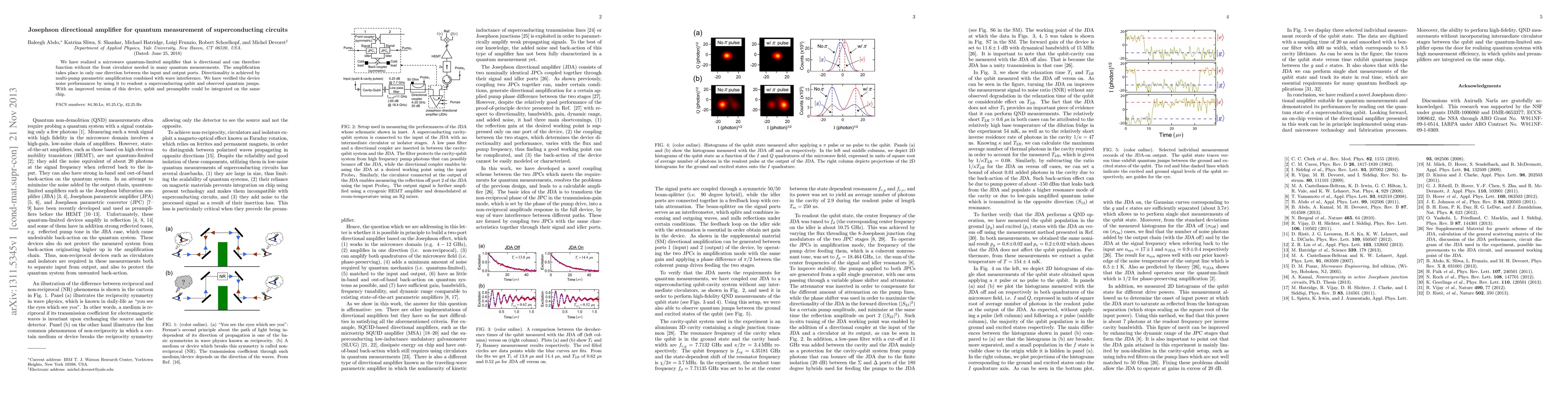 We have realized a microwave quantum-limited amplifier that is directional and can therefore function without the front circulator needed in many quantum measurements. The amplification takes place in only one direction between the input and output ports. Directionality is achieved by multi-pump parametric amplification combined with wave interference. We have verified the device noise performances by using it to readout a superconducting qubit and observed quantum jumps. With an improved version of this device, qubit and preamplifer could be integrated on the same chip.