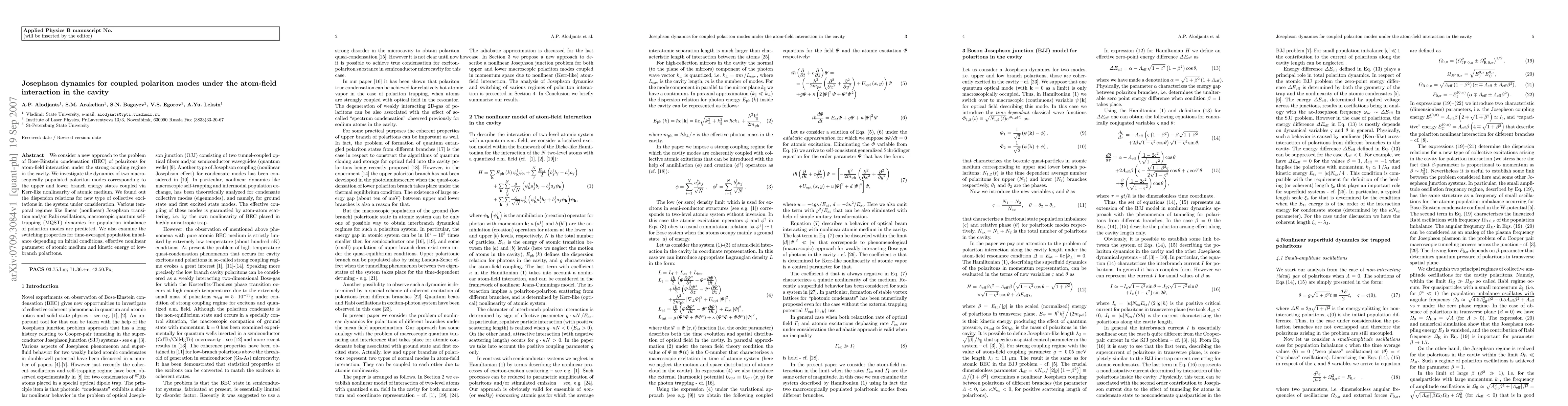 This paper explores the dynamics of coupled polariton modes in a cavity under strong atom-field interaction, revealing new dispersion relations for collective excitations. It predicts various temporal regimes including Josephson transitions, Rabi oscillations, and macroscopic quantum self-trapping, and examines the switching properties influenced by initial conditions and atomic medium parameters.