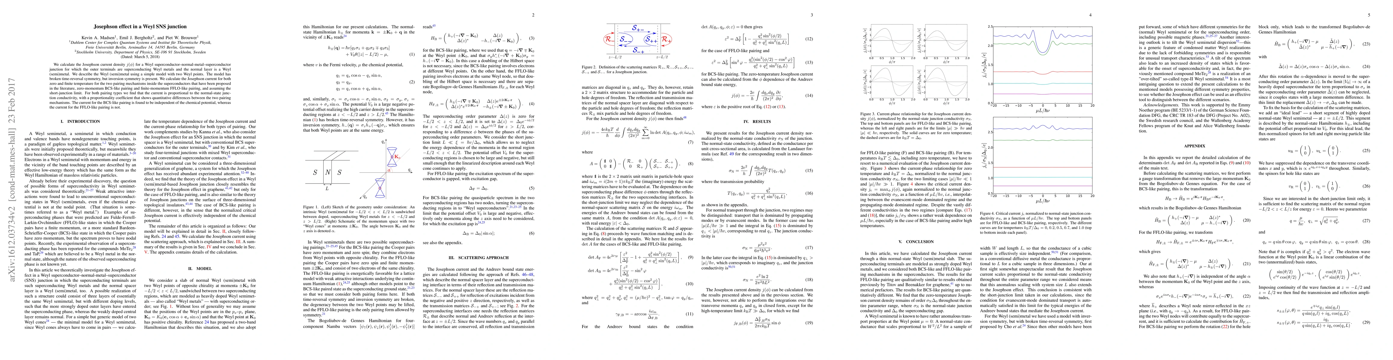 We calculate the Josephson current density j(phi) for a Weyl superconductor--normal-metal--superconductor junction for which the outer terminals are superconducting Weyl metals and the normal layer is a Weyl (semi)metal. We describe the Weyl (semi)metal using a simple model with two Weyl points. The model has broken time-reveresal symmetry, but inversion symmetry is present. We calculate the Josephson current for both zero and finite temperature for the two pairing mechanisms inside the superconductors that have been proposed in the literature, zero-momentum BCS-like pairing and finite-momentum FFLO-like pairing, and assuming the short-junction limit. For both pairing types we find that the current is proportional to the normal-state junction conductivity, with a proportionality coefficient that shows quantitative differences between the two pairing mechanisms. The current for the BCS-like pairing is found to be independent of the chemical potential, whereas the current for the FFLO-like pairing is not.