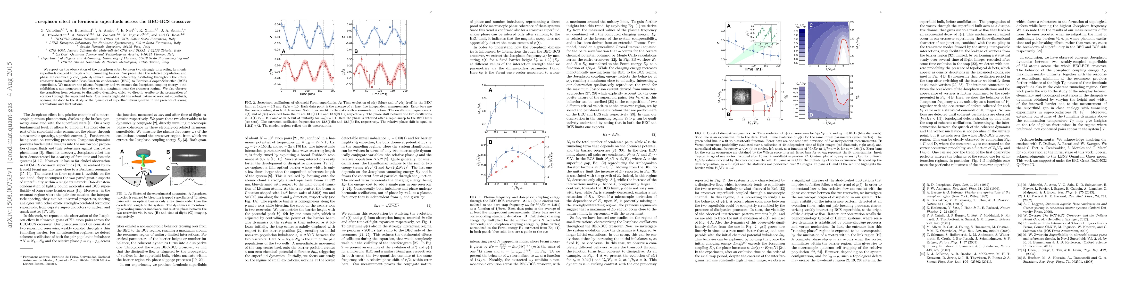 This paper observes the Josephson effect in fermionic superfluids across the BEC-BCS crossover, demonstrating coherent oscillations of relative population and phase. It reveals non-monotonic behaviors in plasma frequency and Josephson coupling energy, highlighting the transition from coherent to dissipative dynamics due to vortex propagation.
