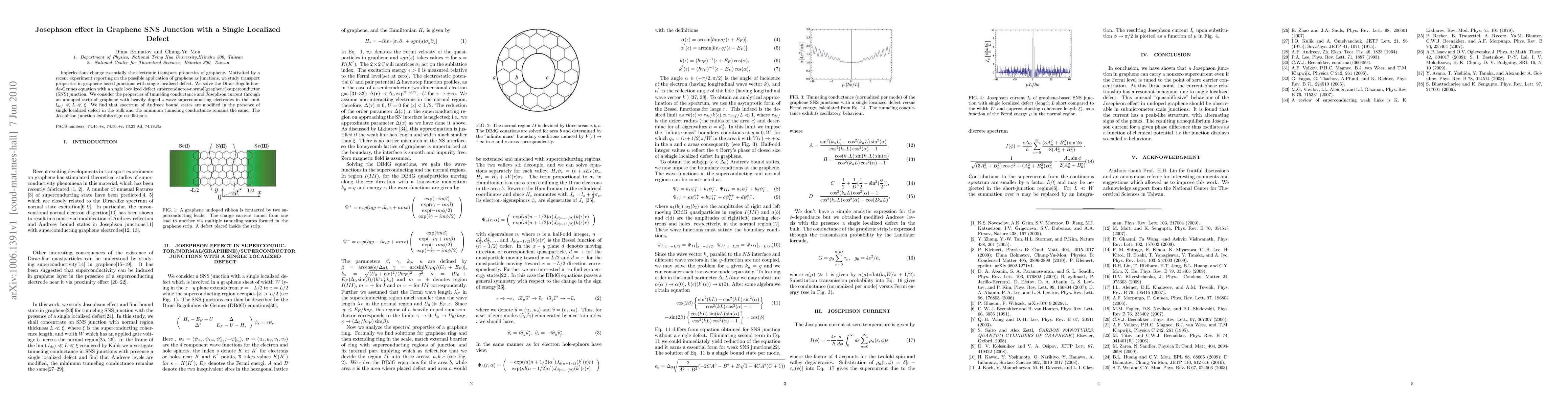 This paper investigates the impact of a single localized defect on electronic transport in graphene-based SNS junctions, finding that while the minimum tunneling conductance remains unchanged, the spectrum of Andreev bound states is modified and the Josephson current exhibits sign oscillations.