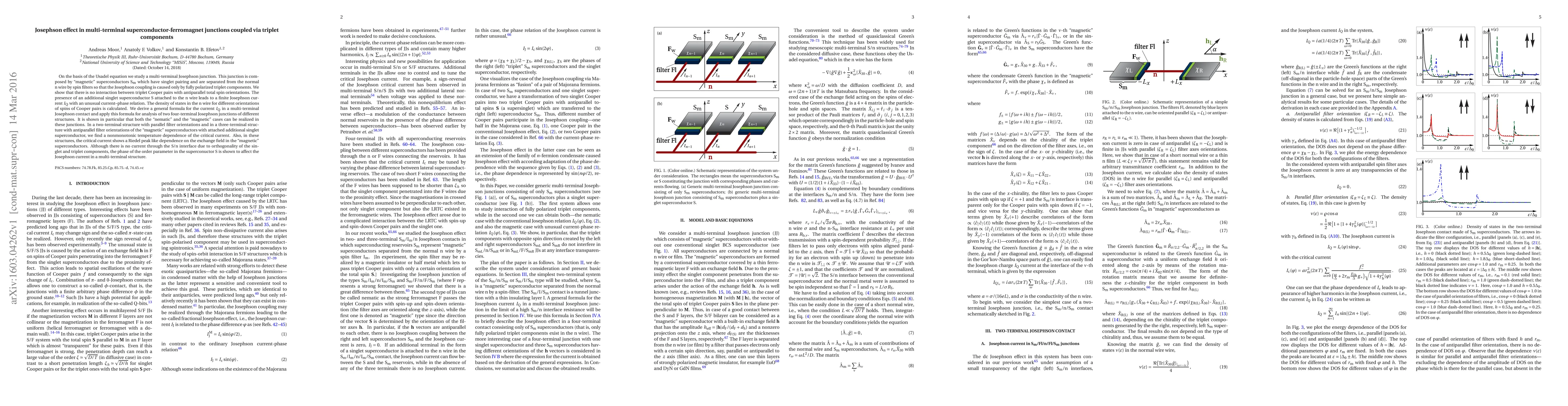 On the basis of the Usadel equation we study a multi-terminal Josephson junction. This junction is composed by "magnetic" superconductors S$_{\text{m}}$ which have singlet pairing and are separated from the normal n~wire by spin filters so that the Josephson coupling is caused only by fully polarized triplet components. We show that there is no interaction between triplet Cooper pairs with antiparallel total spin orientations. The presence of an additional singlet superconductor S attached to the n wire leads to a finite Josephson current $I_{\text{Q}}$ with an unusual current--phase relation. The density of states in the n wire for different orientations of spins of Cooper pairs is calculated. We derive a general formula for the current $I_{\text{Q}}$ in a multi-terminal Josephson contact and apply this formula for analysis of two four-terminal Josephson junctions of different structures. It is shown in particular that both the "nematic" and the "magnetic" cases can be realized in these junctions. In a two-terminal structure with parallel filter orientations and in a three-terminal structure with antiparallel filter orientations of the "magnetic" superconductors with attached additional singlet superconductor, we find a nonmonotonic temperature dependence of the critical current. Also, in these structures, the critical current shows a Riedel peak like dependence on the exchange field in the "magnetic" superconductors. Although there is no current through the S/n interface due to orthogonality of the singlet and triplet components, the phase of the order parameter in the superconuctor S is shown to affect the Josephson current in a multi-terminal structure.
