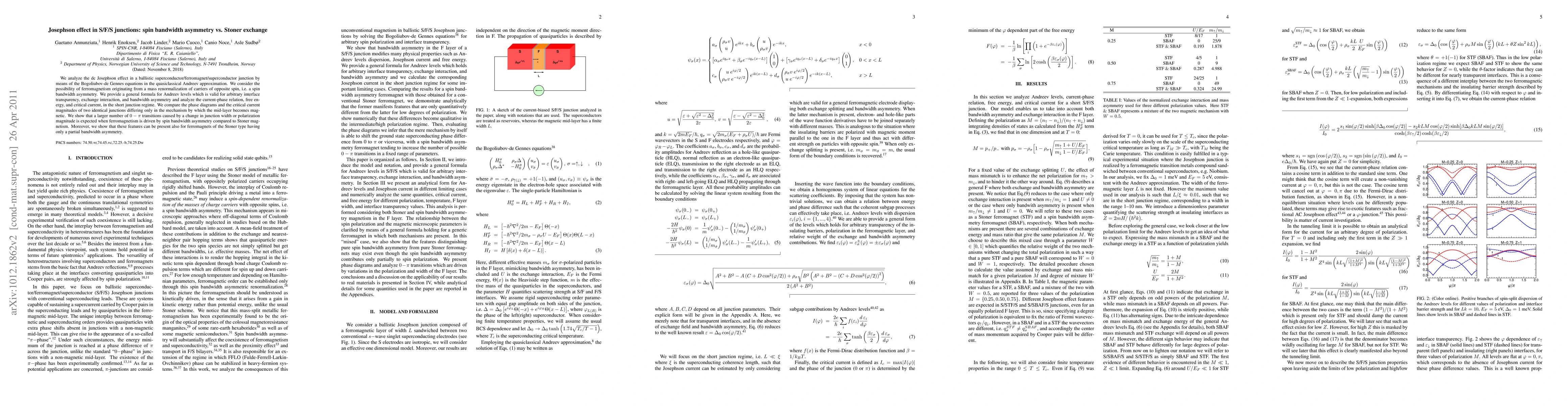 We analyze the dc Josephson effect in a ballistic superconductor/ferromagnet/superconductor junction by means of the Bogoliubov-de Gennes equations in the quasiclassical Andreev approximation. We consider the possibility of ferromagnetism originating from a mass renormalization of carriers of opposite spin, i.e. a spin bandwidth asymmetry. We provide a general formula for Andreev levels which is valid for arbitrary interface transparency, exchange interaction, and bandwidth asymmetry. We analyze the current-phase relation, the critical current, and the free energy in the short junction regime. We demonstrate that a larger number of $0-\pi$ transitions caused by a change in junction width or polarization magnitude is expected when ferromagnetism is driven by spin bandwidth asymmetry compared to Stoner magnetism, and that the same mechanism is likely responsible for the flowing of a larger critical current. We compare the phase diagrams of two identical junctions differing only in the mechanism by which the mid layer becomes magnetic, i.e. Stoner magnetism or bandwidth asymmetry. In particular, we point out that for these two cases, the phase difference across the junction in the ground state need not be the same, even if the polarizations are equal.