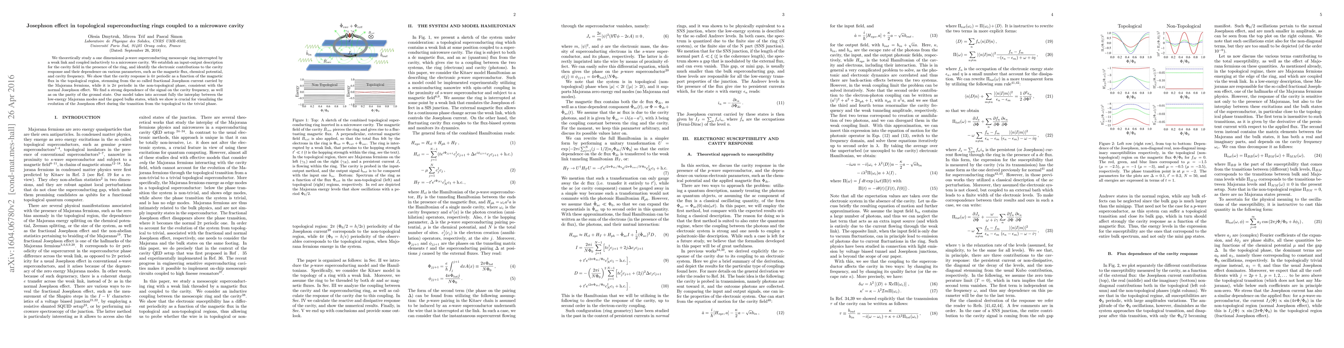 We theoretically study a one dimensional p-wave superconducting mesoscopic ring interrupted by a weak link and coupled inductively to a microwave cavity. We establish an input-output description for the cavity field in the presence of the ring, and identify the electronic contributions to the cavity response and their dependence on various parameters, such as the magnetic flux, chemical potential, and cavity frequency. We show that the cavity response is $4\pi$ periodic as a function of the magnetic flux in the topological region, stemming from the so called fractional Josephson current carried by the Majorana fermions, while it is $2\pi$ periodic in the non-topological phase, consistent with the normal Josephson effect. We find a strong dependence of the signal on the cavity frequency, as well as on the parity of the ground state. Our model takes into account fully the interplay between the low-energy Majorana modes and the gaped bulks states, which we show is crucial for visualizing the evolution of the Josephson effect during the transition from the topological to the trivial phase.