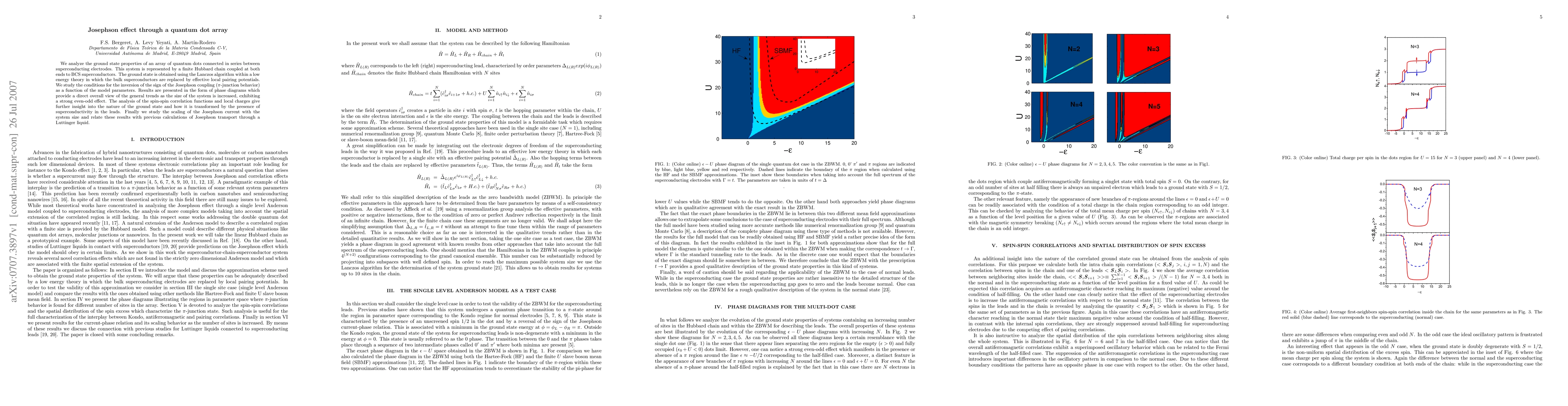 We analyze the ground state properties of an array of quantum dots connected in series between superconducting electrodes. This system is represented by a finite Hubbard chain coupled at both ends to BCS superconductors. The ground state is obtained using the Lanczos algorithm within a low energy theory in which the bulk superconductors are replaced by effective local pairing potentials. We study the conditions for the inversion of the sign of the Josephson coupling ($\pi$-junction behavior) as a function of the model parameters. Results are presented in the form of phase diagrams which provide a direct overall view of the general trends as the size of the system is increased, exhibiting a strong even-odd effect. The analysis of the spin-spin correlation functions and local charges give further insight into the nature of the ground state and how it is transformed by the presence of superconductivity in the leads. Finally we study the scaling of the Josephson current with the system size and relate these results with previous calculations of Josephson transport through a Luttinger liquid.