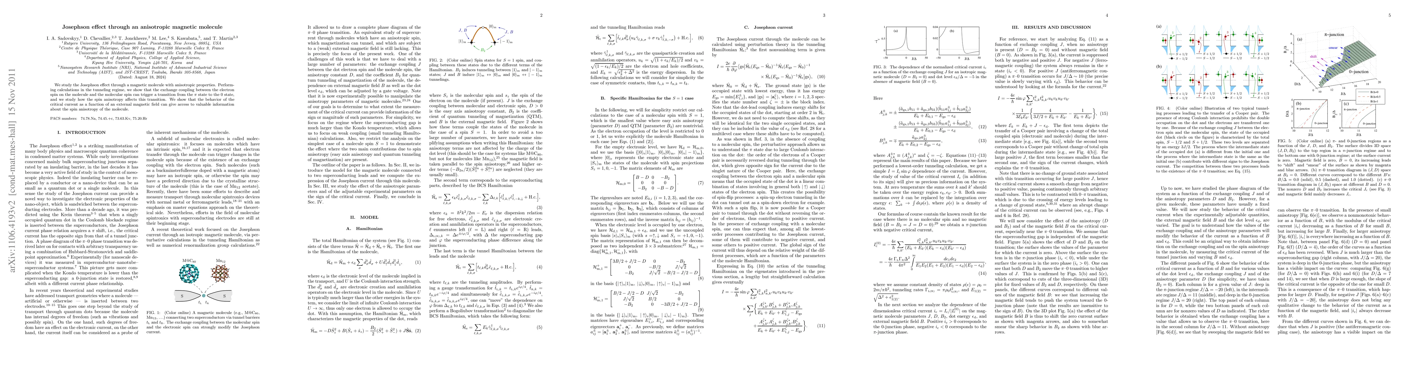 We study the Josephson effect through a magnetic molecule with anisotropic properties. Performing calculations in the tunneling regime, we show that the exchange coupling between the electron spin on the molecule and the molecular spin can trigger a transition from the $\pi$ state to the 0 state, and we study how the spin anisotropy affects this transition. We show that the behavior of the critical current as a function of an external magnetic field can give access to valuable information about the spin anisotropy of the molecule.