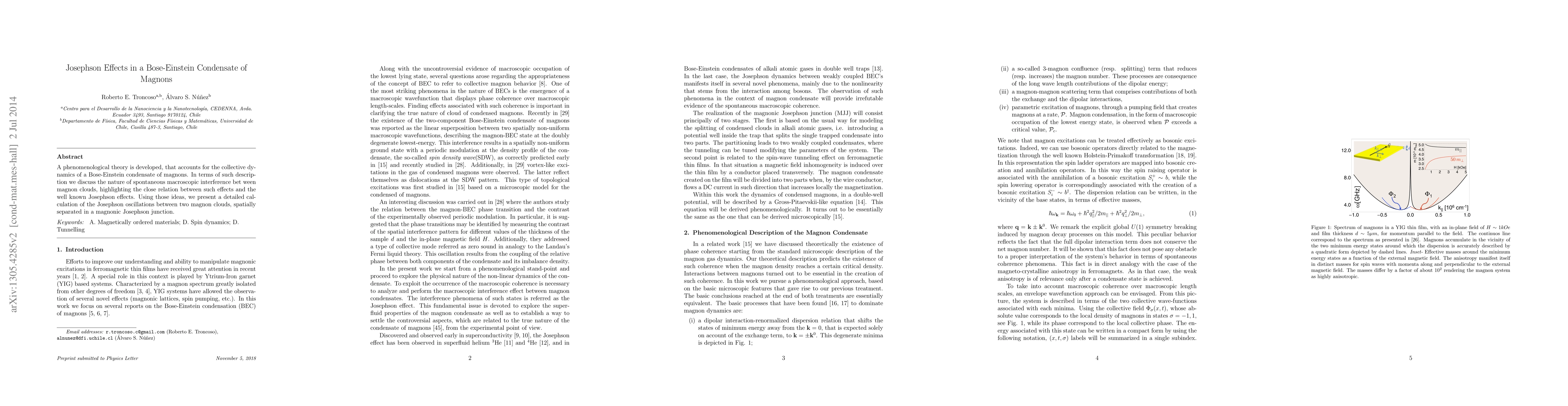 A phenomenological theory is developed, that accounts for the collective dynamics of a Bose-Einstein condensate of magnons. In terms of such description we discuss the nature of spontaneous macroscopic interference between magnon clouds, highlighting the close relation between such effects and the well known Josephson effects. Using those ideas we present a detailed calculation of the Josephson oscillations between two magnon clouds, spatially separated in a magnonic Josephson junction.