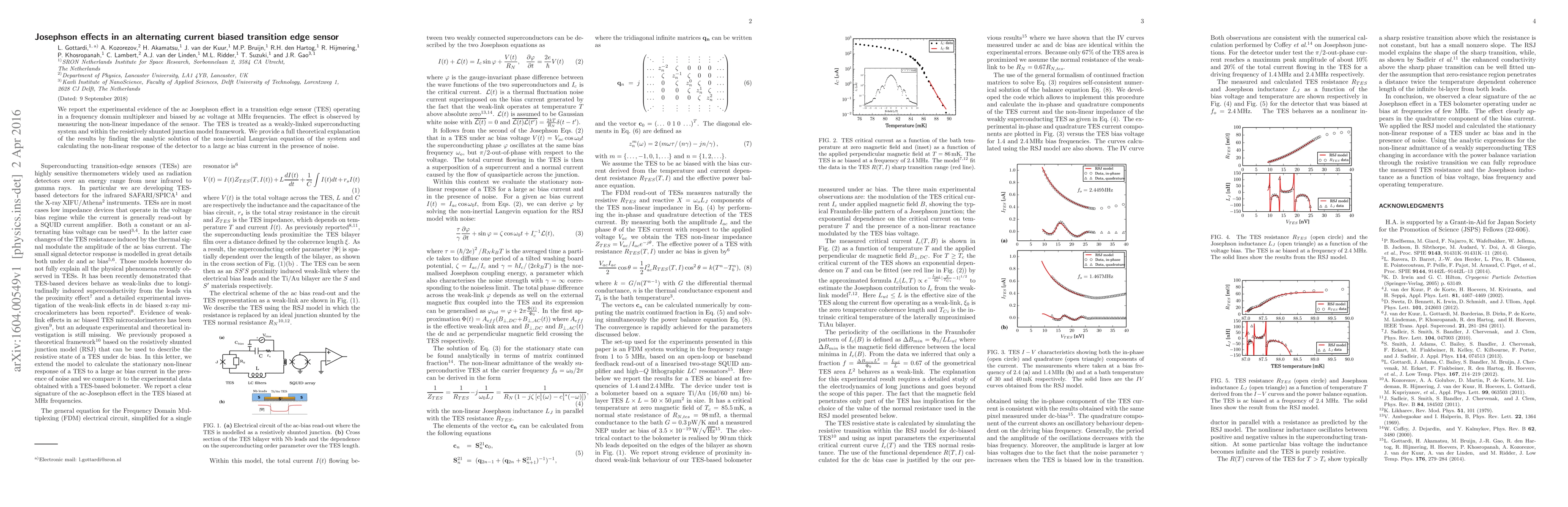 This paper reports the first experimental evidence of the ac Josephson effect in a transition edge sensor (TES) biased by an alternating current at MHz frequencies, observed through the sensor's non-linear impedance. The study provides a theoretical framework using the resistively shunted junction model and an analytic solution to explain the observed effect.