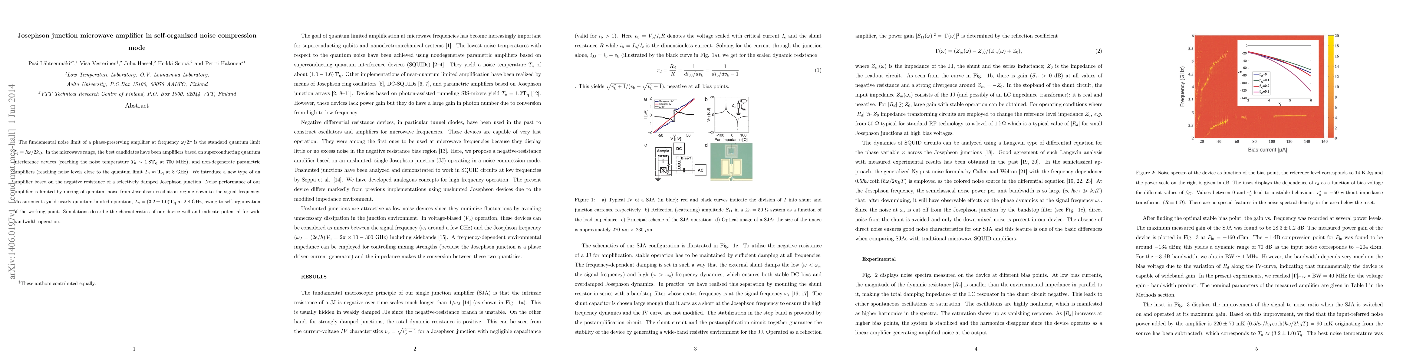 This paper introduces a novel microwave amplifier based on a selectively damped Josephson junction, achieving nearly quantum-limited noise performance at 2.8 GHz through self-organization of the working point, demonstrating potential for wide bandwidth operation. Simulations corroborate the device's characteristics and its noise performance.