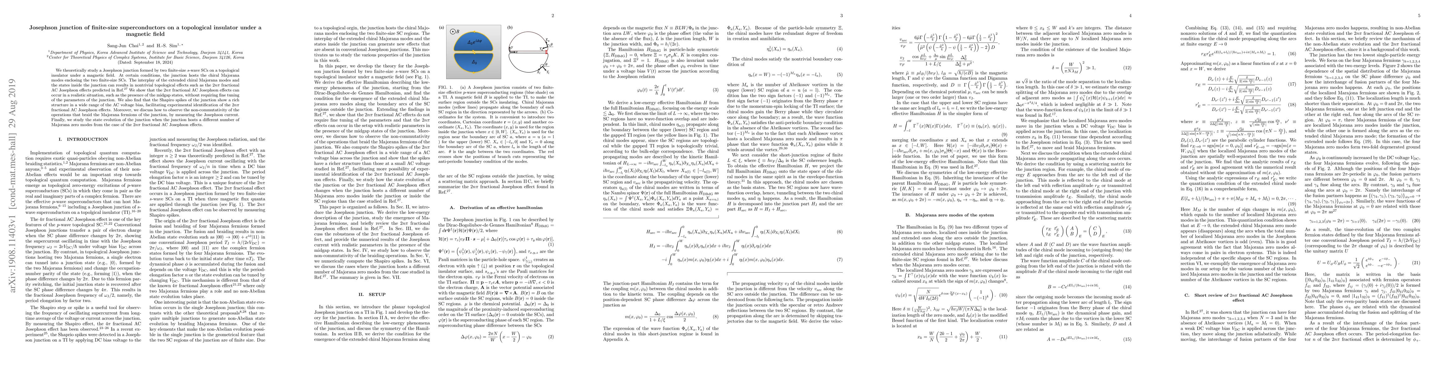 We theoretically study a Josephson junction formed by two finite-size $s$-wave SCs on a topological insulator under a magnetic field. At certain conditions, the junction hosts the chiral Majorana modes enclosing the two finite-size SCs. The interplay of the extended chiral Majorana modes and the states inside the junction can results in nontrivial topological effects such as the $2n \pi$ fractional AC Josephson effects predicted in Ref.~\cite{ChoiSim} We show that the $2n \pi$ fractional AC Josephson effects can occur in a realistic situation, such as the presence of the midgap states, without requiring fine tuning of the parameters of the junction. We also find that the Shapiro spikes of the junction show a rich structure in a wide range of the AC voltage bias, facilitating experimental identification of the $2n \pi$ fractional AC Josephson effects. Moreover, we discuss how to observe the non-commutativity of the operations that braid the Majorana fermions of the junction, by measuring the Josephson current. Finally, we study the state evolution of the junction when the junction hosts a different number of Majorana zero modes from the case of the $2n \pi$ fractional AC Josephson effects.