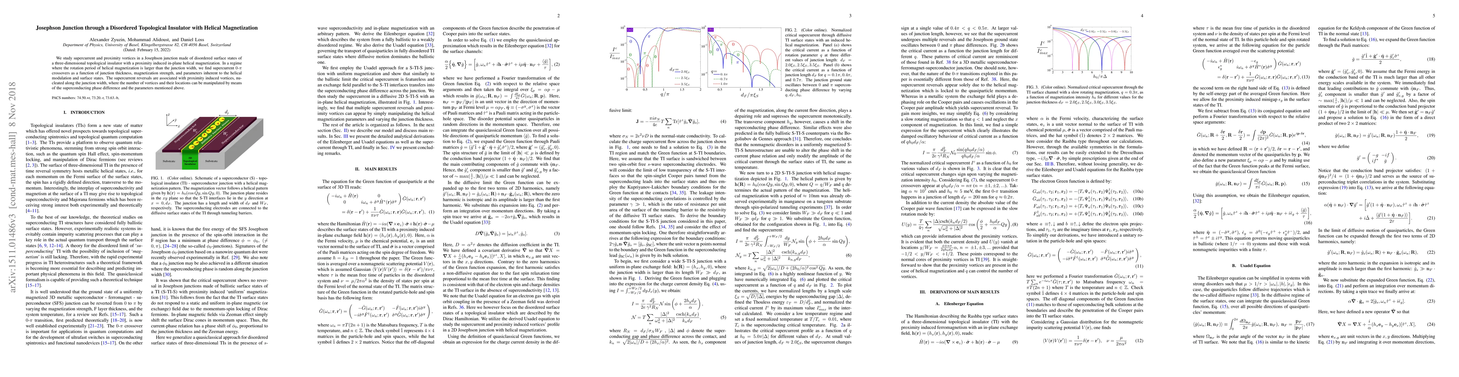 This paper investigates supercurrent and vortices in a Josephson junction formed from disordered topological insulator surface states with induced helical magnetization. It reveals supercurrent 0-{π} transitions influenced by junction thickness, magnetization strength, and helical modulation parameters, with vortex behavior linked to the superconducting phase difference.