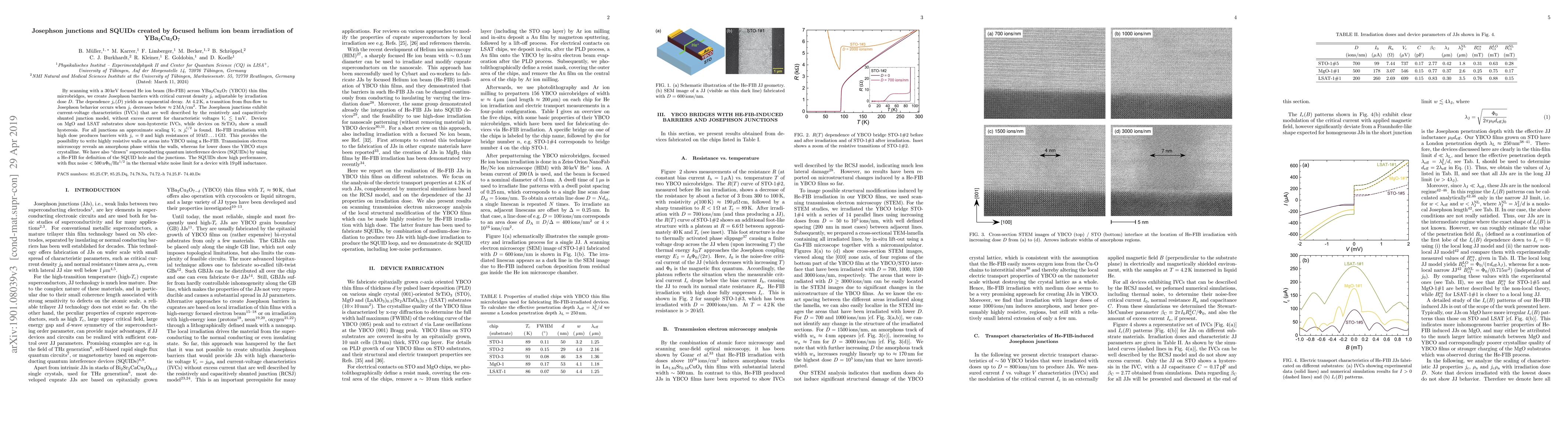 This paper demonstrates the creation of Josephson junctions and SQUIDs in YBa$_2$Cu$_3$O$_7$ thin films using a focused helium ion beam, showing adjustable critical current density and high-performance SQUIDs with low flux noise. The junctions exhibit well-defined current-voltage characteristics and can be made highly resistive by high-dose irradiation.