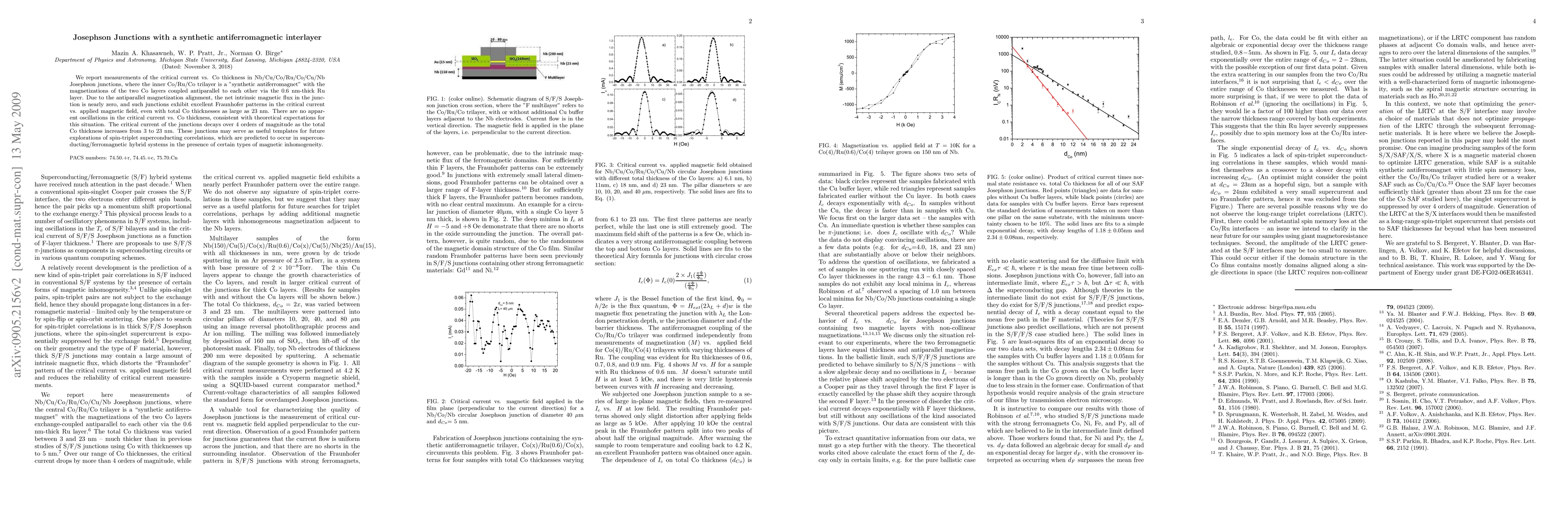 We report measurements of the critical current vs. Co thickness in Nb/Cu/Co/Ru/Co/Cu/Nb Josephson junctions, where the inner Co/Ru/Co trilayer is a "synthetic antiferromagnet" with the magnetizations of the two Co layers coupled antiparallel to each other via the 0.6 nm-thick Ru layer. Due to the antiparallel magnetization alignment, the net intrinsic magnetic flux in the junction is nearly zero, and such junctions exhibit excellent Fraunhofer patterns in the critical current vs. applied magnetic field, even with total Co thicknesses as large as 23 nm. There are no apparent oscillations in the critical current vs. Co thickness, consistent with theoretical expectations for this situation. The critical current of the junctions decays over 4 orders of magnitude as the total Co thickness increases from 3 to 23 nm. These junctions may serve as useful templates for future explorations of spin-triplet superconducting correlations, which are predicted to occur in supercon- ducting/ferromagnetic hybrid systems in the presence of certain types of magnetic inhomogeneity.