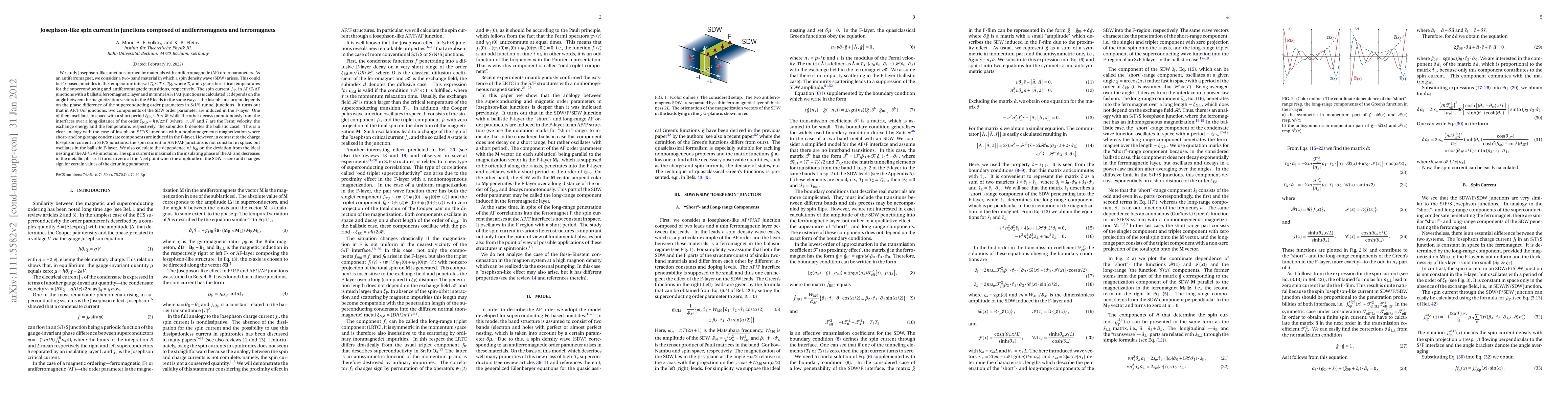 We study Josephson-like junctions formed by materials with antiferromagnetic (AF) order parameters. As an antiferromagnet, we consider a two-band material in which a spin density wave (SDW) arises. This could be Fe-based pnictides in the temperature interval ${T_{\text{c}}\leq T\leq T_{N}}$, where $T_{c}$ and $T_{N}$ are the critical temperatures for the superconducting and antiferromagnetic transitions, respectively. The spin current $j_{\text{Sp}}$ in AF/F/AF junctions with a ballistic ferromagnetic layer and in tunnel AF/I/AF junctions is calculated. It depends on the angle between the magnetization vectors in the AF leads in the same way as the Josephson current depends on the phase difference of the superconducting order parameters in S/I/S tunnel junctions. It turns out that in AF/F/AF junctions, two components of the SDW order parameter are induced in the F\nobreakdash-layer. One of them oscillates in space with a short period ${\xi_{\text{F,b}} \sim \hbar v/\mathcal{H}}$ while the other decays monotonously from the interfaces over a long distance of the order ${\xi_{\text{N,b}}=\hbar v/2\pi T}$ (where $v$, $\mathcal{H}$ and $T$ are the Fermi velocity, the exchange energy and the temperature, respectively; the subindex $\text{b}$ denotes the ballistic case). This is a clear analogy with the case of Josephson S/F/S junctions with a nonhomogeneous magnetization where short- and long\nobreakdash-range condensate components are induced in the F\nobreakdash-layer. However, in contrast to the charge Josephson current in S/F/S junctions, the spin current in AF/F/AF junctions is not constant in space, but oscillates in the ballistic F\nobreakdash-layer. We also calculate the dependence of $j_{\text{Sp}}$ on the deviation from the ideal nesting in the AF/I/AF junctions.
