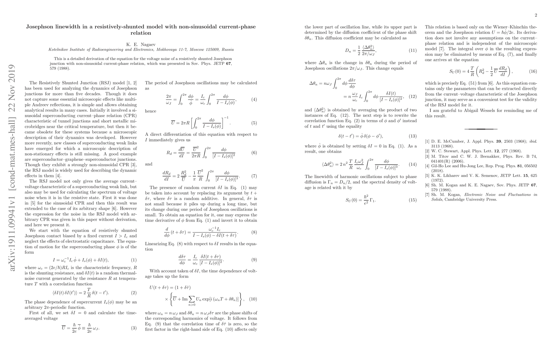 This paper derives the equation for the voltage noise in a resistively-shunted Josephson junction with a non-sinusoidal current-phase relation, extending previous work from Sov. Phys. JETP. The findings provide a deeper understanding of the noise characteristics in such junctions.