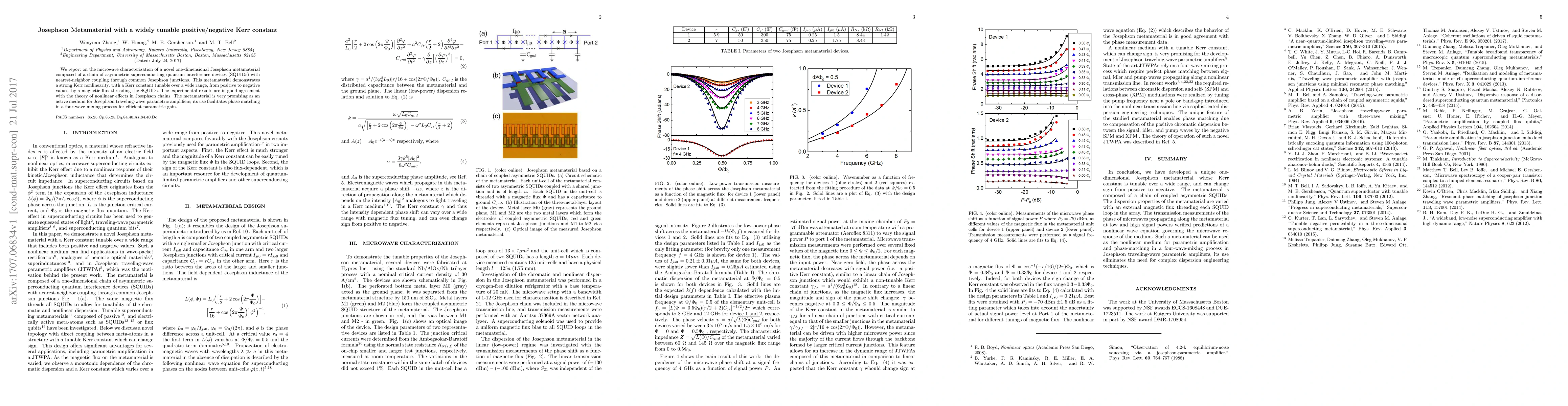 This paper describes a tunable one-dimensional Josephson metamaterial made of SQUIDs, showing strong Kerr nonlinearity with a tunable Kerr constant from positive to negative values via magnetic flux. The material is promising for use in parametric amplifiers and four-wave mixing processes.