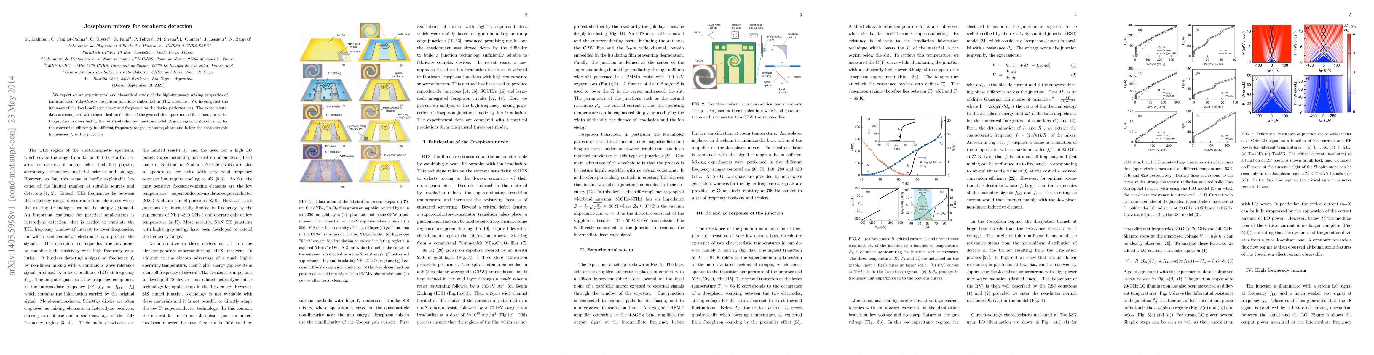This paper investigates the high-frequency mixing capabilities of ion-irradiated YBa2Cu3O7 Josephson junctions in THz antennas, comparing experimental results with theoretical models. The study finds good agreement between the conversion efficiency data and predictions across various frequency ranges.