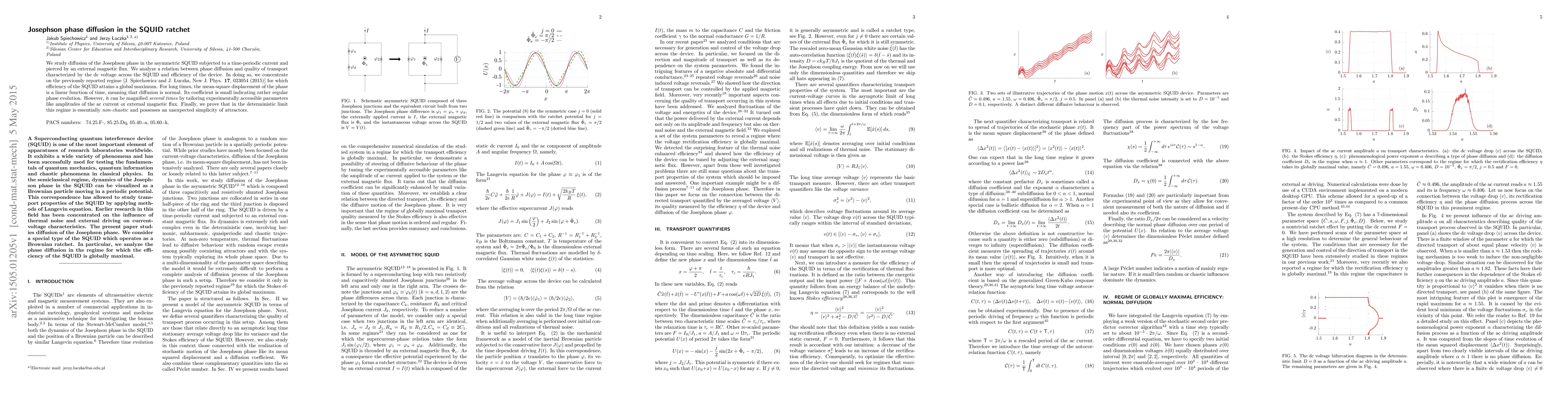 This paper investigates the diffusion of Josephson phase in an asymmetric SQUID under periodic current and external magnetic flux, finding normal phase diffusion with a small coefficient. The study reveals that phase diffusion can be significantly amplified by adjusting the ac current or magnetic flux, and demonstrates that the optimal efficiency regime is non-chaotic with simple attractors.